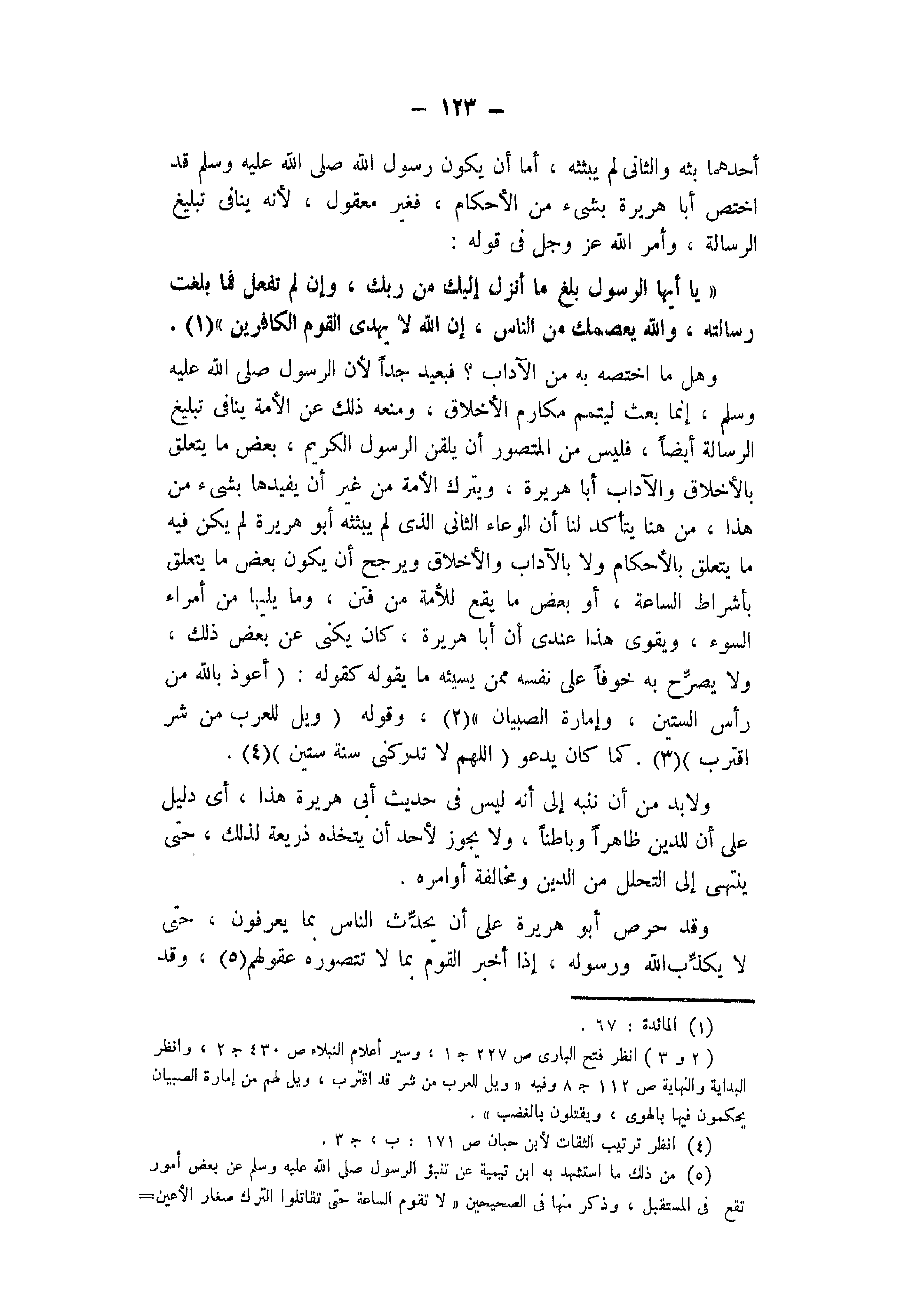 أحدهما بثه والثاني لم يبثثه، أما أنْ يكون رسول الله - صَلَّى اللَّهُ عَلَيْهِ وَسَلَّمَ - قد اخْتَصَّ أبا هريرة بشيء من الأحكام، فغير معقول، لأنه ينافي تبليغ الرسالة، وأمر الله - عَزَّ وَجَلَّ - في قوله: {يَا أَيُّهَا الرَّسُولُ بَلِّغْ مَا أُنْزِلَ إِلَيْكَ مِنْ رَبِّكَ وَإِنْ لَمْ تَفْعَلْ فَمَا بَلَّغْتَ رِسَالَتَهُ وَاللَّهُ يَعْصِمُكَ مِنَ النَّاسِ إِنَّ اللَّهَ لَا يَهْدِي الْقَوْمَ الْكَافِرِينَ} (1).