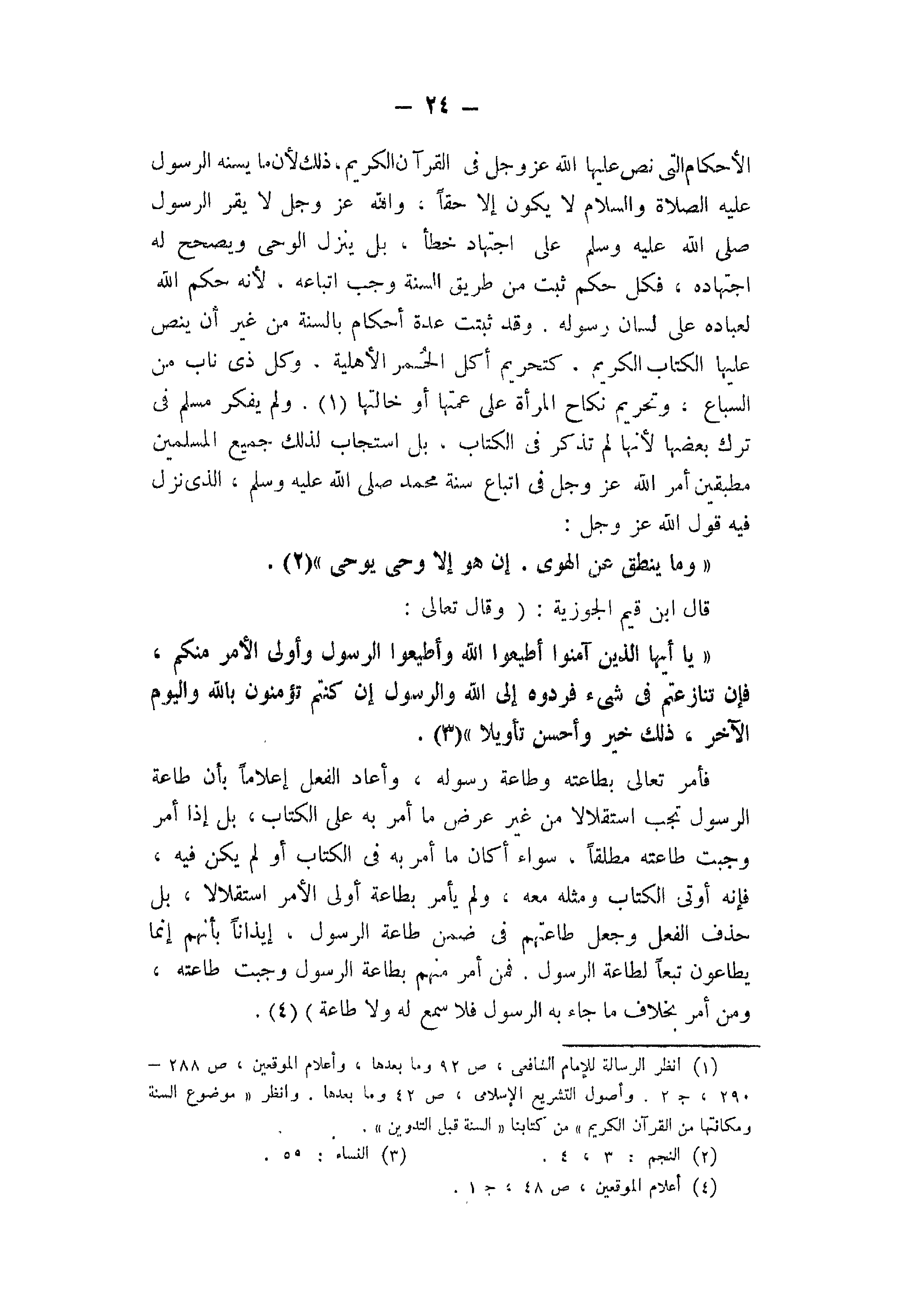 الأحكام التي نص عليها الله - عَزَّ وَجَلَّ - في القرآن الكريم، ذلك لأنَّ ما يسُنُّهُ الرسول - عَلَيْهِ الصَلاَةُ وَالسَّلاَمُ - لا يكون إلاَّ حقاً، والله - عَزَّ وَجَلَّ - لا يقر الرسول - صَلََّى اللهُ عَلَيْهِ وَسَلَّمَ - على اجتهاد خطأ، بل ينزل الوحي ويُصَحِّحُ له اجتهاده، فكل حكم ثبت من طريق السُنَّة وجب اتِّباعه، لأنه حكم الله لعباده على لسان رسوله. وقد ثبتت عدة أحكام بالسُنَّة من غير أنْ ينُصَّ عليها الكتاب الكريم، كتحريم أكل الحُمُر الأهلية، وكل ذي ناب من السباع، وتحريم نكاح المرأة على عمَّتها أو خالتها (1). ولم يفكر مسلم في ترك بعضها لأنها لم تذكر في الكتاب، بل استجاب لذلك جميع المسلمين مُطبِّقين أمر الله - عَزَّ وَجَلَّ - في اتِّباع سُنَّة محمد - صَلََّى اللهُ عَلَيْهِ وَسَلَّمَ -، الذي نزل فيه قول الله - عَزَّ وَجَلَّ -: {وَمَا يَنْطِقُ عَنِ الْهَوَى، إِنْ هُوَ إِلَّا وَحْيٌ يُوحَى} (2).