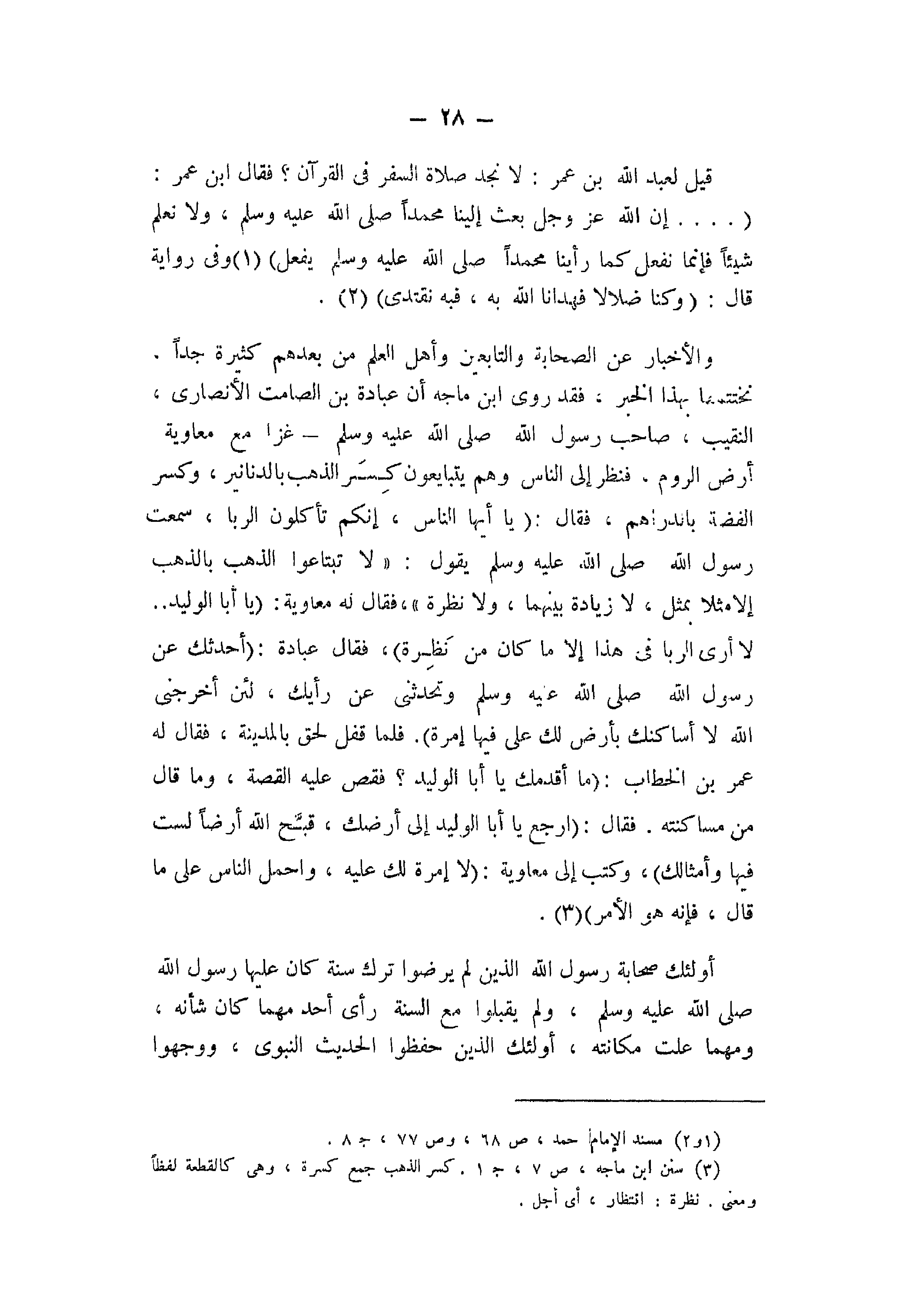 والأخبار عن الصحابة والتابعين وأهل العلم من بعدهم كثيرة جداً. نختتمها بهذا الخبر، فقد روى ابن ماجه أنَّ عُبَادَةَ بْنَ الصَّامِتِ الأَنْصَارِيَّ، النَّقِيبَ، صَاحِبَ رَسُولِ اللَّهِ صَلَّى اللهُ عَلَيْهِ وَسَلَّمَ: غَزَا مَعَ مُعَاوِيَةَ أَرْضَ الرُّومِ، فَنَظَرَ إِلَى النَّاسِ وَهُمْ يَتَبَايَعُونَ كِسَرَ الذَّهَبِ بِالدَّنَانِيرِ، وَكِسَرَ الْفِضَّةِ بِالدَّرَاهِمِ، فَقَالَ: «يَا أَيُّهَا النَّاسُ، إِنَّكُمْ تَأْكُلُونَ الرِّبَا، سَمِعْتُ رَسُولَ اللَّهِ صَلَّى اللهُ عَلَيْهِ وَسَلَّمَ يَقُولُ: «لا تَبْتَاعُوا الذَّهَبَ بِالذَّهَبِ، إِلَّا مِثْلاً بِمِثْلٍ، لاَ زِيَادَةَ بَيْنَهُمَا وَلا نَظِرَةً»، فَقَالَ: لَهُ مُعَاوِيَةُ: «يَا أَبَا الْوَلِيدِ، لا أَرَى الرِّبَا فِي هَذَا، إِلا مَا كَانَ مِنْ نَظِرَةٍ»، فَقَالَ عُبَادَةُ: «أُحَدِّثُكَ عَنْ رَسُولِ اللَّهِ صَلَّى اللهُ عَلَيْهِ وَسَلَّمَ، وَتُحَدِّثُنِي عَنْ رَأْيِكَ لَئِنْ أَخْرَجَنِي اللَّهُ لا أُسَاكِنُكَ بِأَرْضٍ لَكَ عَلَيَّ فِيهَا إِمْرَةٌ»، فَلَمَّا قَفَلَ لَحِقَ بِالْمَدِينَةِ، فَقَالَ لَهُ عُمَرُ بْنُ الْخَطَّابِ: «مَا أَقْدَمَكَ يَا أَبَا الْوَلِيدِ؟ فَقَصَّ عَلَيْهِ الْقِصَّةَ، وَمَا قَالَ مِنْ مُسَاكَنَتِهِ، فَقَالَ: «ارْجِعْ يَا أَبَا الْوَلِيدِ إِلَى أَرْضِكَ، فَقَبَحَ اللَّهُ أَرْضًا لَسْتَ فِيهَا وَأَمْثَالُكَ»، وَكَتَبَ إِلَى مُعَاوِيَةَ: لا إِمْرَةَ لَكَ عَلَيْهِ، وَاحْمِلِ النَّاسَ عَلَى مَا قَالَ، فَإِنَّهُ هُوَ الأَمْرُ» (3).
