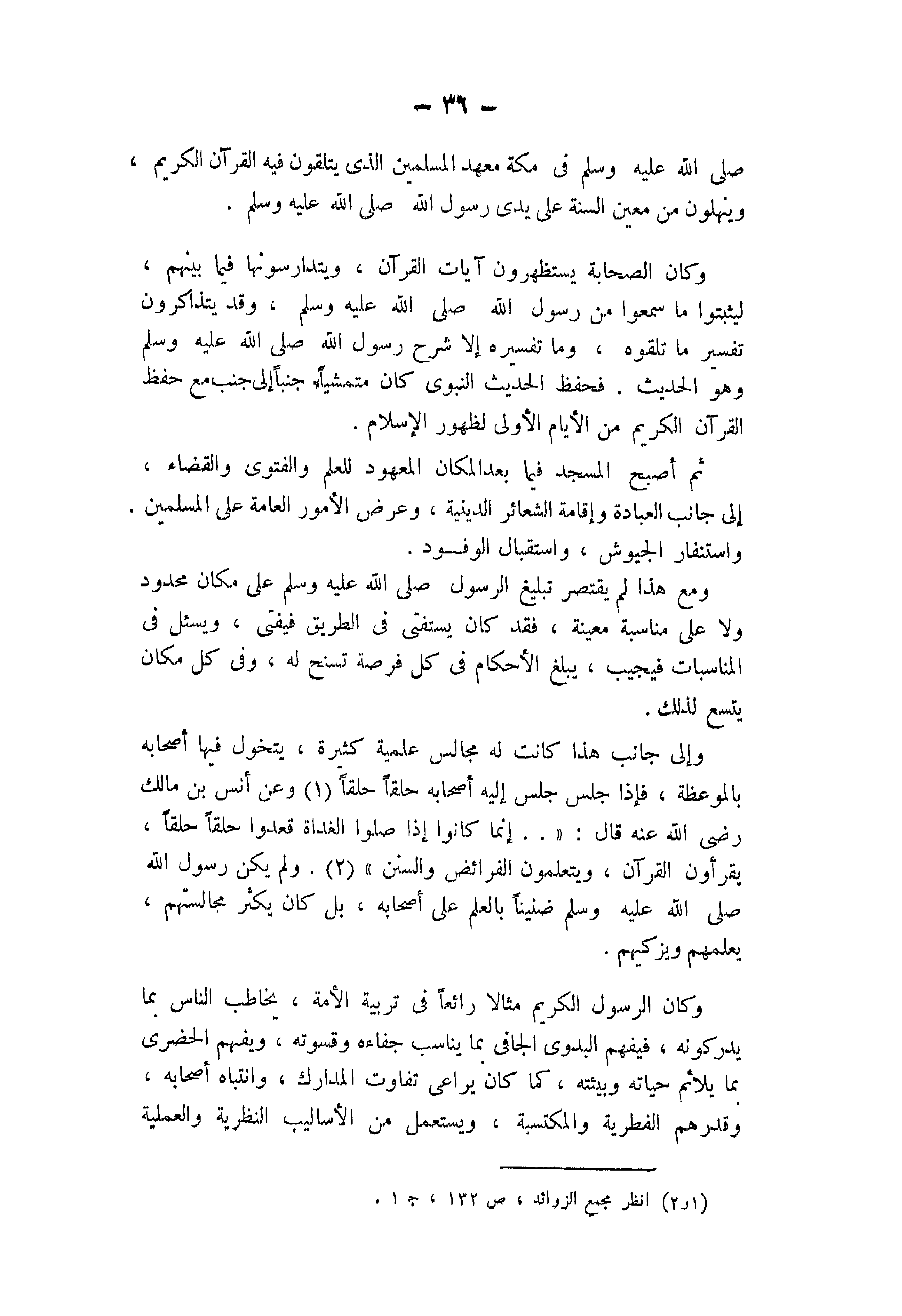 وإلى جانب هذا كانت له مجالس علميَّة كثيرة، يتخوَّلُ فيها أصحابه بالموعظة، فإذا جلس جلس إليه أصحابه حلقاً حلقاً (1) وعن أنس بن مالك - رَضِيَ اللهُ عَنْهُ - قال: « ... إِنَّمَا كَانُوا إِذَا صَلَّوُا الْغَدَاةَ قَعَدُوا حِلَقًا حِلَقًا يَقْرَأُونَ الْقُرْآنَ وَيَتَعَلَّمُونَ الْفَرَائِضَ وَالسُّنَنَ» (2). ولم يكن رسول الله - صَلََّى اللهُ عَلَيْهِ وَسَلَّمَ - ضنيناً بالعلم على أصحابه، بل كان يكثر مجالستهم، يعلِّمُهُم ويزكيهم.