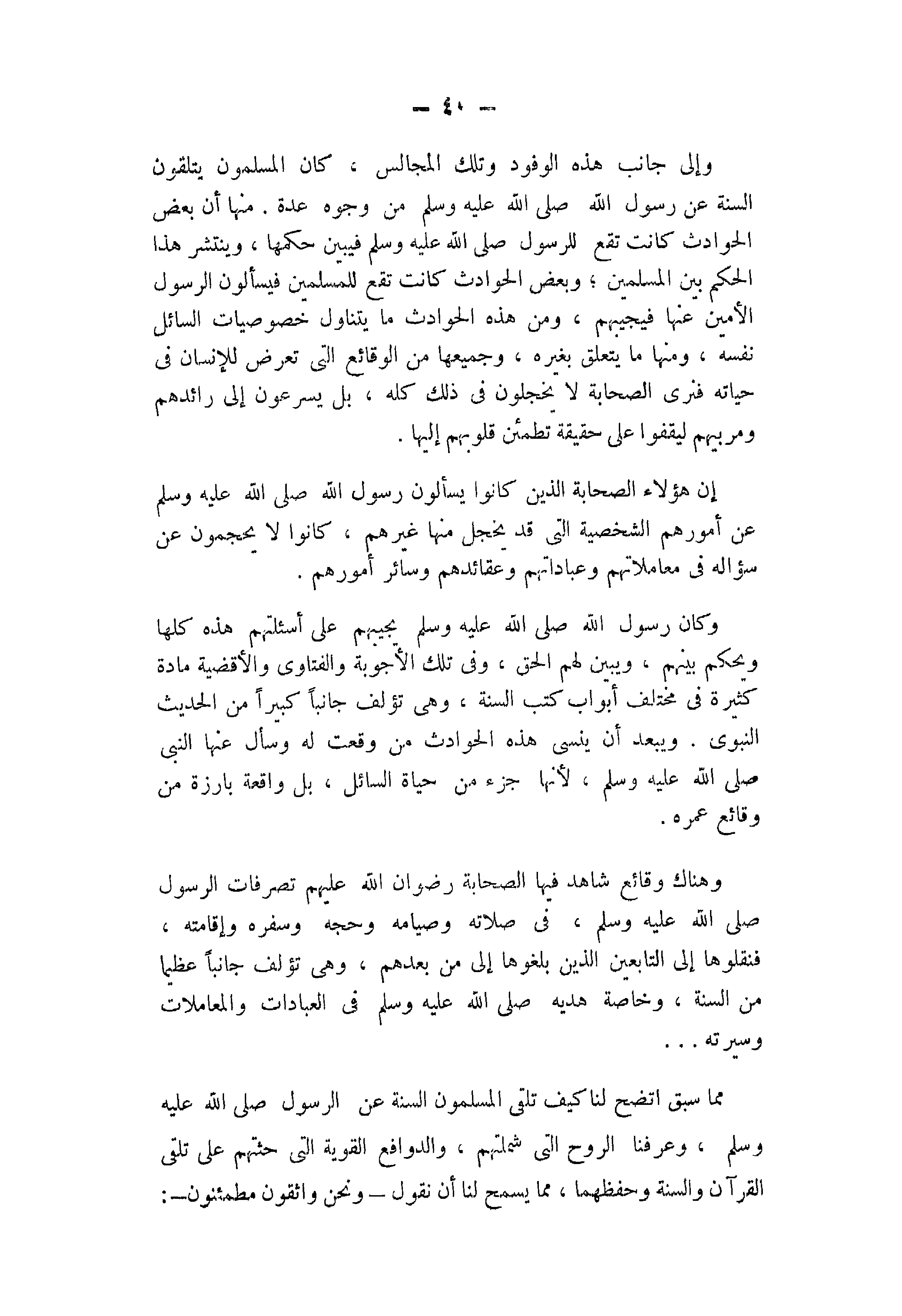 مِمَّا سبق اتَّضح لنا كيف تلقَّى المسلمون السُنَّة عن الرسول - صَلََّى اللهُ عَلَيْهِ وَسَلَّمَ -، وعرفنا الروح التي شملتهم، والدوافع القوية التي حثَّتهم على تلقِّي القرآن والسُنَّة وحفظهما، مِمَّا يسمح لنا أنْ نقول - ونحن واثقون مطمئنُّونَ -: