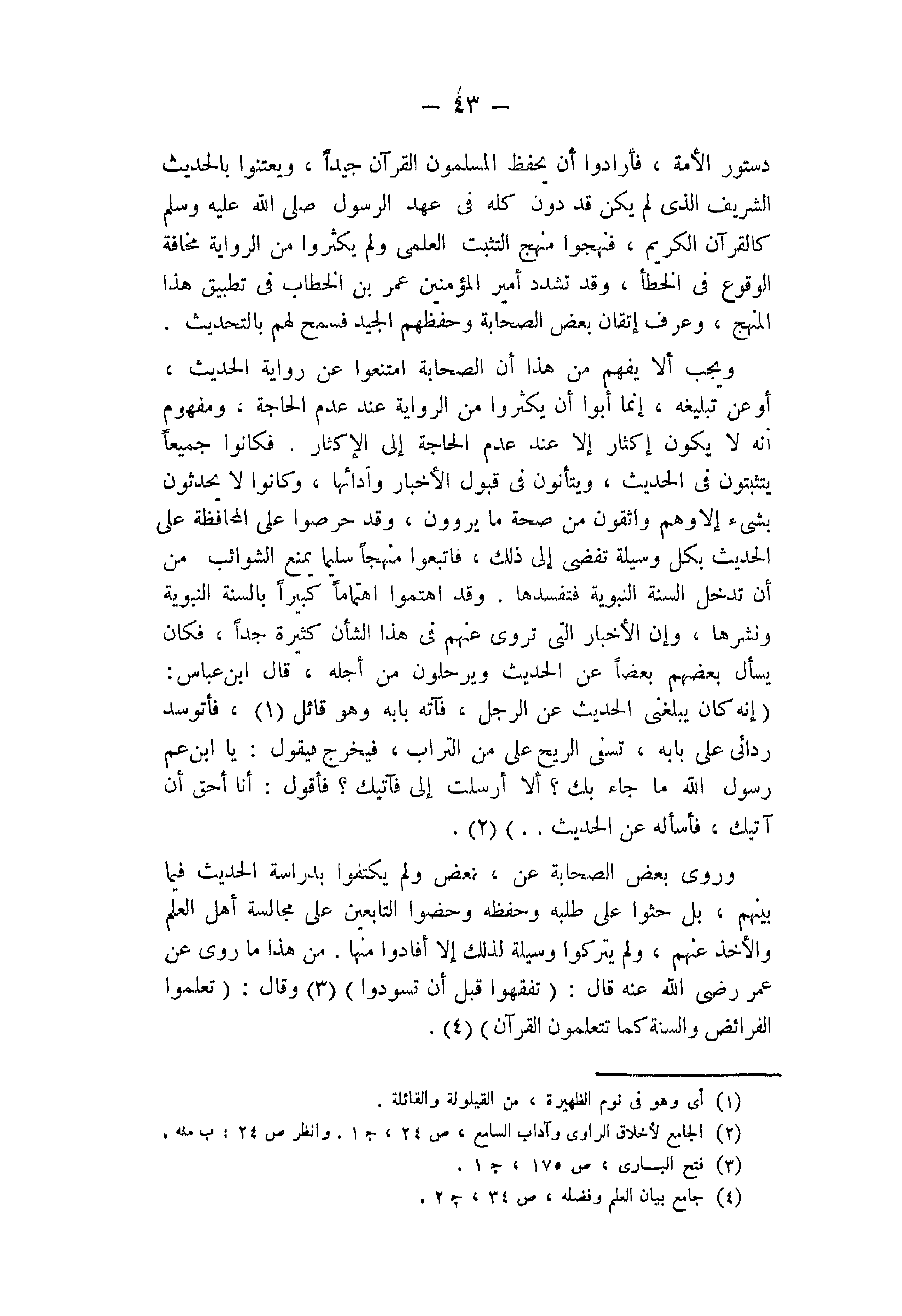 دستور الأمَّة، فأرادوا أنْ يحفظ المسلمون القرآن جيِّداً، ويعتنوا بالحديث الشريف الذي لم يكن قد دُوِّنَ كله في عهد الرسول - صَلََّى اللهُ عَلَيْهِ وَسَلَّمَ - كالقرآن الكريم، فنهجوا منهج التثبت العلمي ولم يكثروا من الرواية مخافة الوقوع في الخطأ، وقد تشدَّدَ أمير المؤمنين عمر بن الخطاب في تطبيق هذا المنهج، وعرف إتقان بعض الصحابة وحفظهم الجَيِّدَ فسمح لهم بالتحديث.