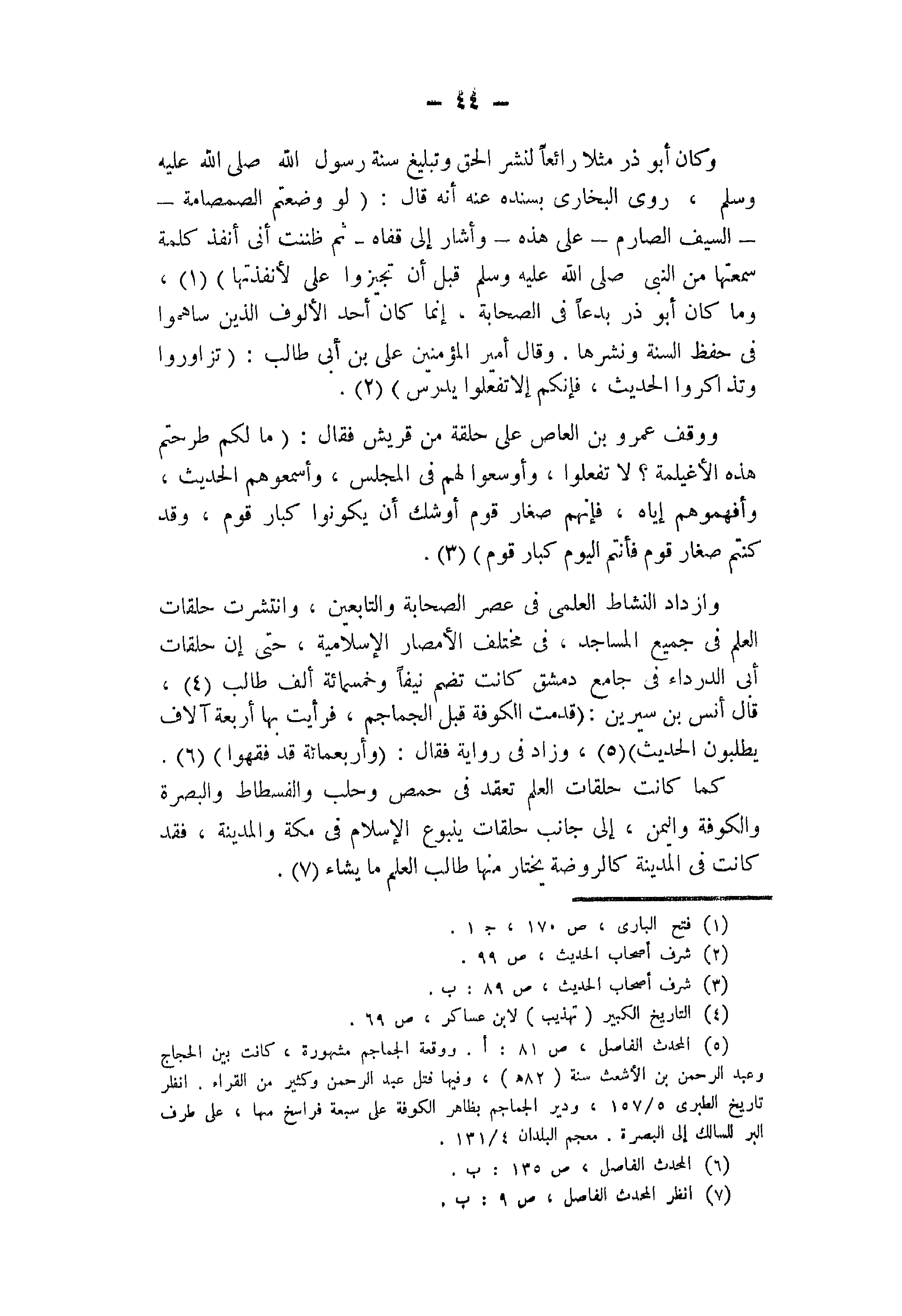 وازداد النشاط العلمي في عصر الصحابة والتابعين، وانتشرت حلقات العلم في جميع المساجد، في مختلف الأمصار الإسلامية، حتى إنَّ حلقات أبي الدرداء في جامع دمشق كانت تَضُمُّ نيفاً وخمسمائة ألف طالب (4)، قال أنس بن سيرين: «قَدِمْتُ الْكُوفَةَ قَبْلَ الْجَمَاجِمِ، فَرَأَيْتُ فِيهَا أَرْبَعَةَ آلاَفٍ يَطْلُبُونَ الْحَدِيثَ» (5)، وزاد في رواية فقال: «وَأَرْبَعَمِائَةٍ قَدْ فَقِهُوا» (6).