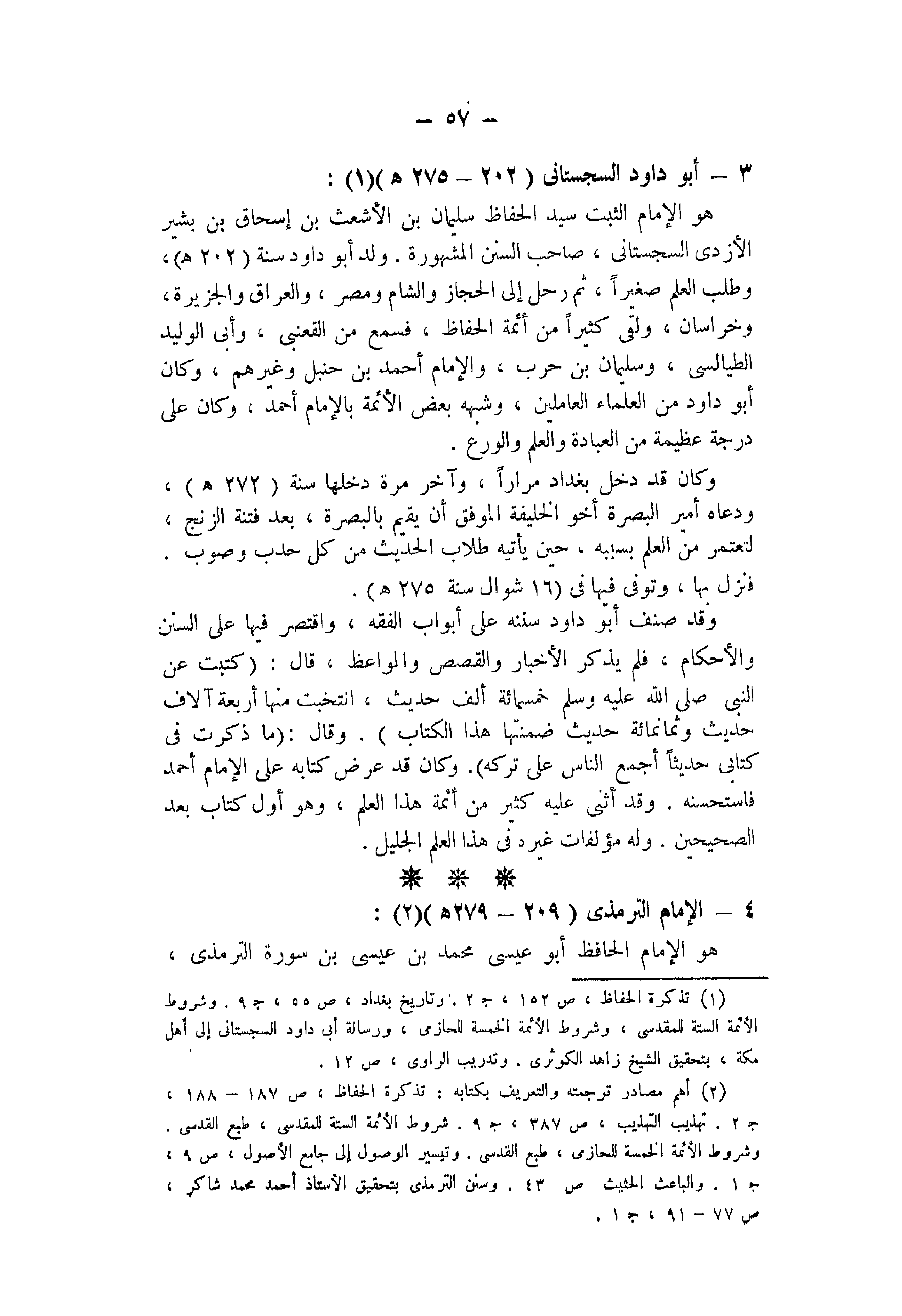 (1) " تذكرة الحفاظ ": ص 152، جـ 2. و " تاريخ بغداد: ص 55، جـ 9. و " رسالة أبي داود السجستاني إلى أهل مكة "، بتحقيق الشيخ زاهدا لكوثري. و " تدريب الراوي ": ص 12.