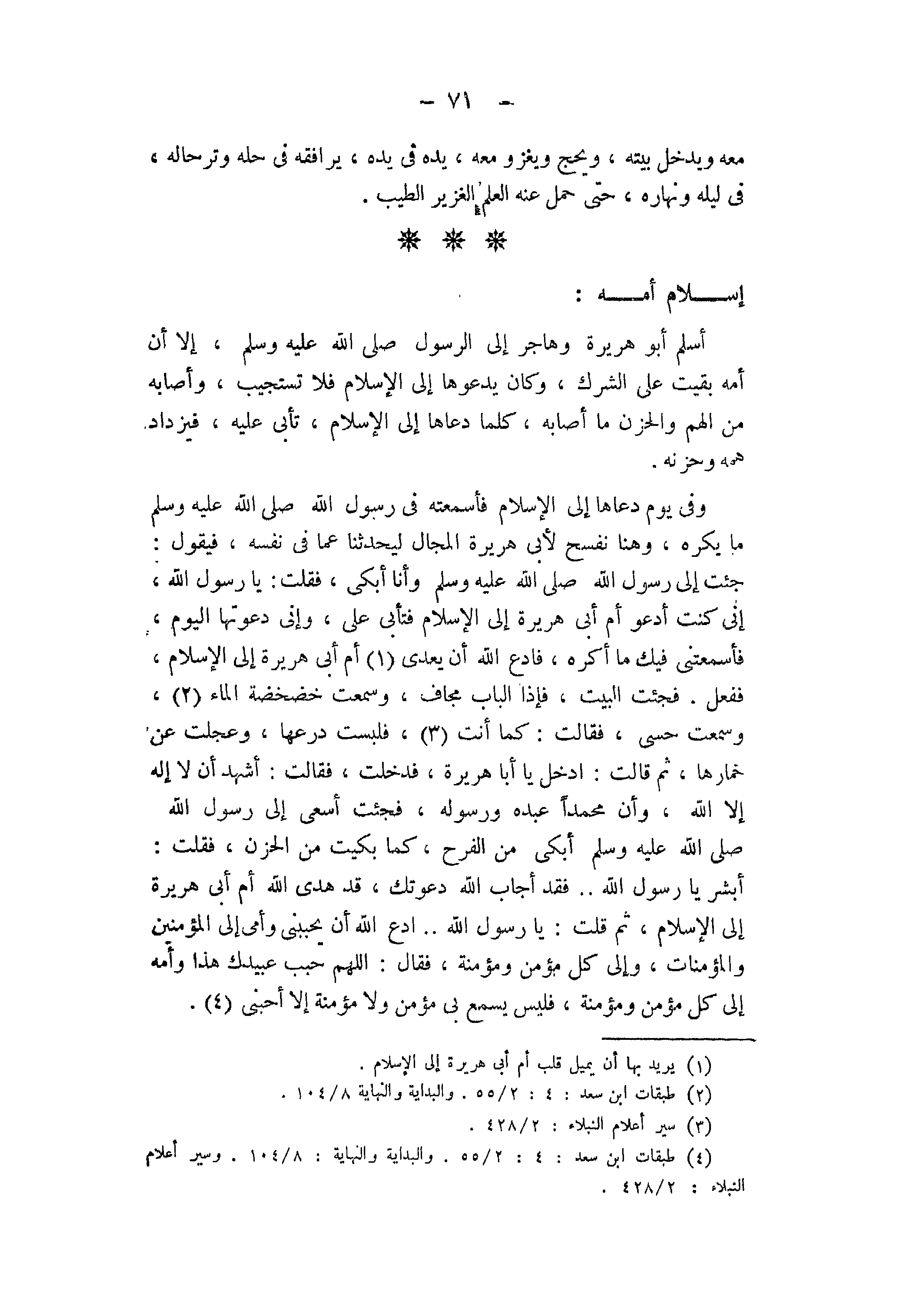 وفي يوم دعاها إلى الإسلام فأسمعته في رسول الله - صَلََّى اللهُ عَلَيْهِ وَسَلَّمَ - ما يكره، وهنا نفسح لأبي هريرة المجال ليُحدِّثنا عما في نفسه، فيقول: جئت إلى رسول الله - صَلََّى اللهُ عَلَيْهِ وَسَلَّمَ - وأنا أبكي، فقلتُ: يا رسول الله، إني كنت أدعو أم أبي هريرة إلى الإسلام فتأبى عَلَيَّ، وإني دعوتُهَا اليوم، فأسمعتني فيك ما أكره، فادع الله أنْ يعدى (1) أم أبي هريرة إلى الإسلام، ففعل. فجئت البيت، فإذا الباب مجاف، وسمعت خضخضة الماء (2)، وسمعت حسي، فقالت: كما أنت (3)، فلبست درعها، وعجلت عن خمارها، ثم قالت: ادخل يا أبا هريرة، فدخلت، فقالت: أشهد أنْ لا إله إلاَّ الله، وأنَّ محمداً عبده ورسوله، فجئت أسعى إلى رسول الله - صَلََّى اللهُ عَلَيْهِ وَسَلَّمَ - أبكي من الفرح، كما بكيت من الحزن، فقلت: أبشر يا رسول الله .. فقد أجاب الله دعوتك، قد هدى الله أم أبي هريرة إلى الإسلام، ثم قلت: يا رسول الله .. ادع الله أنْ يُحَبِّبَنِي وأمِّي إلى المؤمنين والمؤمنات، وإلى كل مؤمن ومؤمنة، فقال: اللهم حَبِّبْ عُبَيْدَكَ هذا وأمه إلى كل من مؤمن ومؤمنة، فليس يسمع بي مؤمن ولا مؤمنة إلاَّ أحبَّني (4).