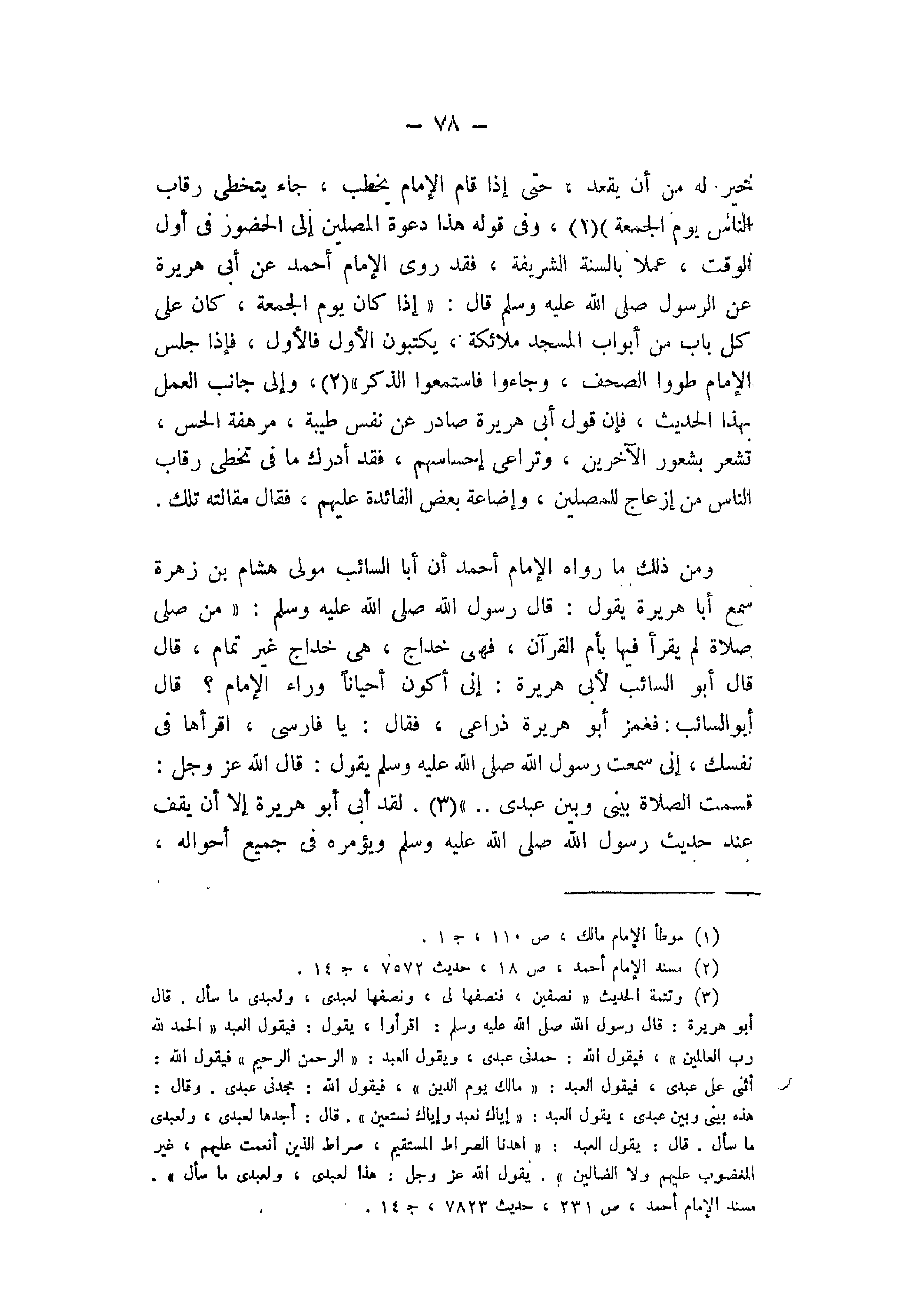 خَيْرٌ لَهُ مِنْ أَنْ يَقْعُدَ، حَتَّى إِذَا قَامَ الإِمَامُ يَخْطُبُ، جَاءَ يَتَخَطَّى رِقَابَ النَّاسِ يَوْمَ الْجُمُعَةِ» (1)، وفي قوله هذا دعوة المصلين إلى الحضور في أول الوقت، عملاً بالسُنَّة الشريفة، فقد روى الإمام أحمد عن أبي هريرة عن الرسول - صَلََّى اللهُ عَلَيْهِ وَسَلَّمَ - قال: «إِذَا كَانَ يَوْمُ الْجُمُعَةِ، كَانَ عَلَى كُلِّ بَابٍ مِنْ أَبْوَابِ الْمَسْجِدِ مَلائِكَةٌ، يَكْتُبُونَ الأَوَّلَ فَالأَوَّلَ، فَإِذَا جَلَسَ الإِمَامُ طَوَوُا الصُّحُفَ، وَجَاءُوا فَاسْتَمَعُوا الذِّكْرَ» (2)، وإلى جانب العمل بهذا الحديث، فإنَّ قول أبي هريرة صادر عن نفس طيِّبة، مرهفة الحسن، تشعر بشعور الآخرين، وتراعي إحساسهم، فقد أدرك ما في تخطي رقاب الناس من إزعاج المصلِّين، وإضاعة بعض الفائدة عليهم، فقال مقالته تلك.