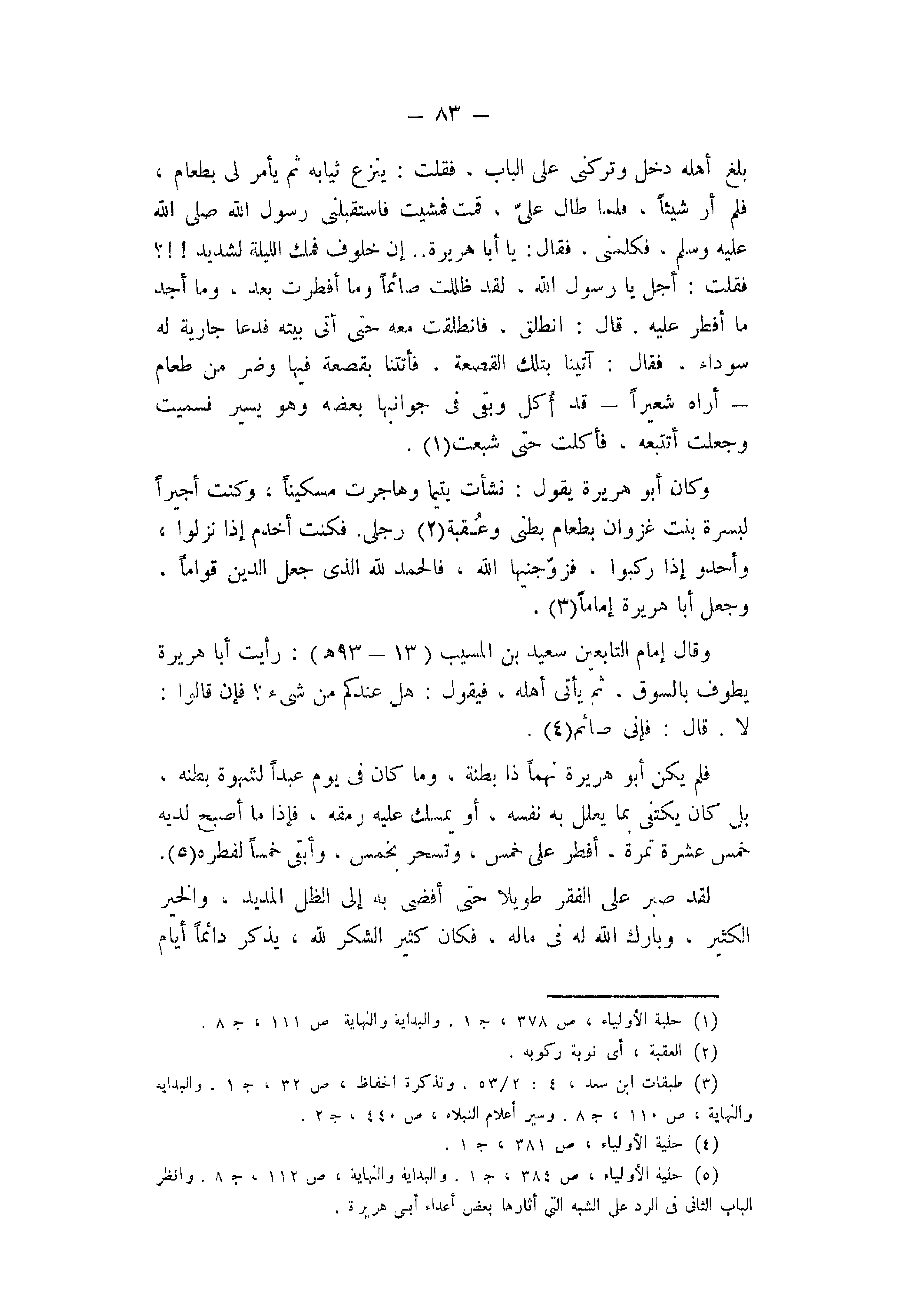 (5) " حلية الأولياء ": ص 384، جـ 1. و " البداية والنهاية ": ص 112، جـ 8. وانظر الباب الثاني في الرد على الشُبه التي أثارها بعض أعداء أبي هريرة.
