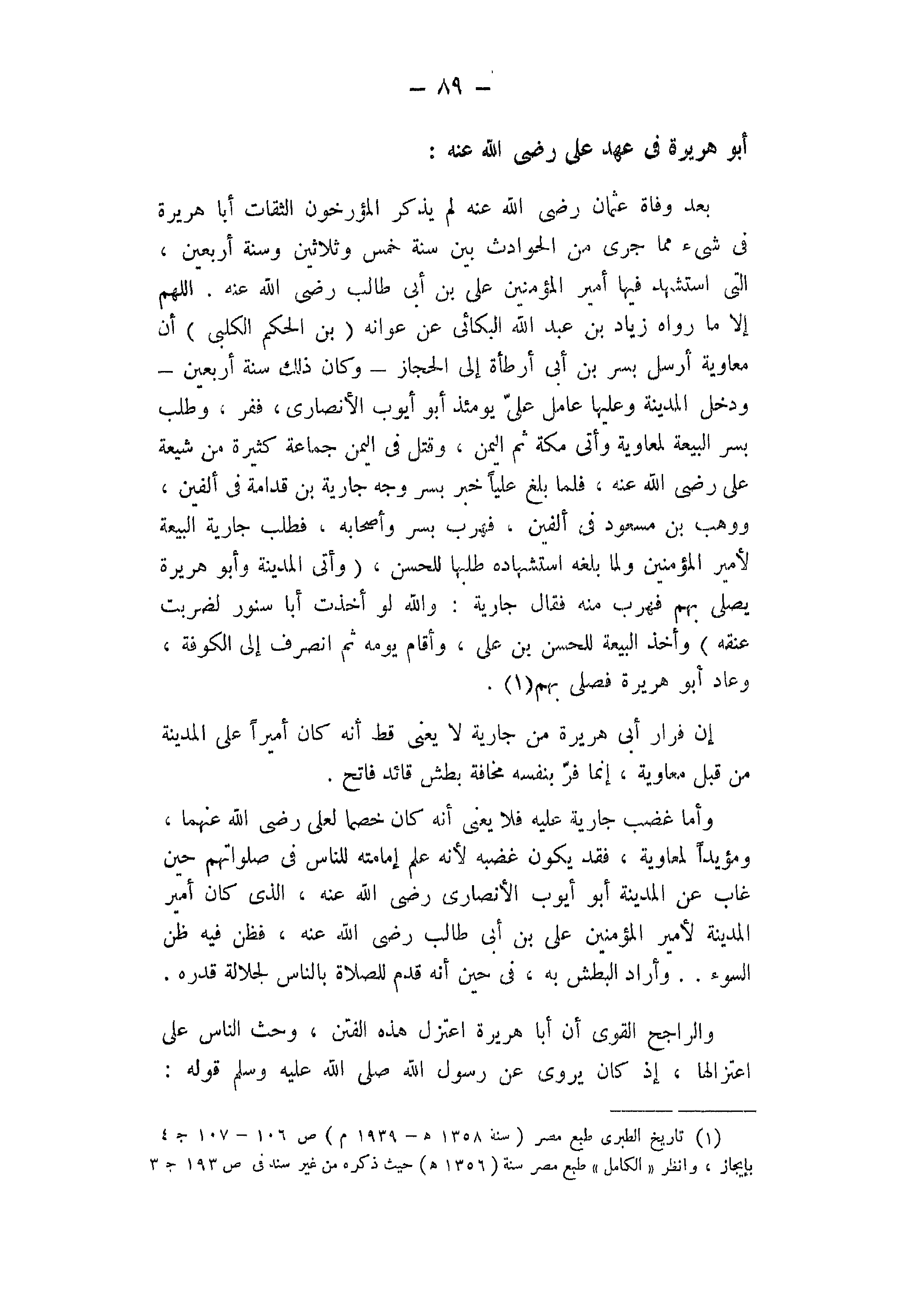 إنَّ فرار أبي هريرة من جارية لا يعني قط أنه كان أميراً على المدينة من قبل معاوية، إنما فَرَّ بنفسه خافة بطش قائد فاتح.