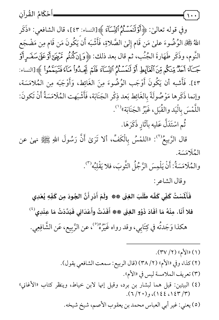 وفي قوله تعالى: {أَوْ لَامَسْتُمُ النِّسَاءَ} [النساء: ٤٣]، قال الشافعي: «ذَكَر اللهُ - عز وجل - الوُضُوءَ على مَن قَام إِلى الصَّلاةِ، فَأَشْبَه أَن يَكُونَ مَن قَام مِن مَضْجَع النَّوم، وذَكَر طَهَارةَ الجُنُب، ثم قال بعد ذلك: {وَإِنْ كُنْتُمْ مَرْضَى أَوْ عَلَى سَفَرٍ أَوْ جَاءَ أَحَدٌ مِنْكُمْ مِنَ الْغَائِطِ أَوْ لَامَسْتُمُ النِّسَاءَ فَلَمْ تَجِدُوا مَاءً فَتَيَمَّمُوا} [النساء: ٤٣]. فَأَشبه أن يَكُونَ أَوْجَب الوُضُوءَ مِنَ الغَائِط، وَأَوْجَبَه مِن المُلامَسَة، وإنما ذَكَرها مَوْصُولَةً بِالغَائِط بَعد ذِكْر الجَنَابَة، فَأَشْبَهت المُلَامَسَةُ أَنْ تَكونَ: اللَّمْسَ بِالْيَد والقُبَل، غَيْرُ الجَنَابَة» (¬١).
