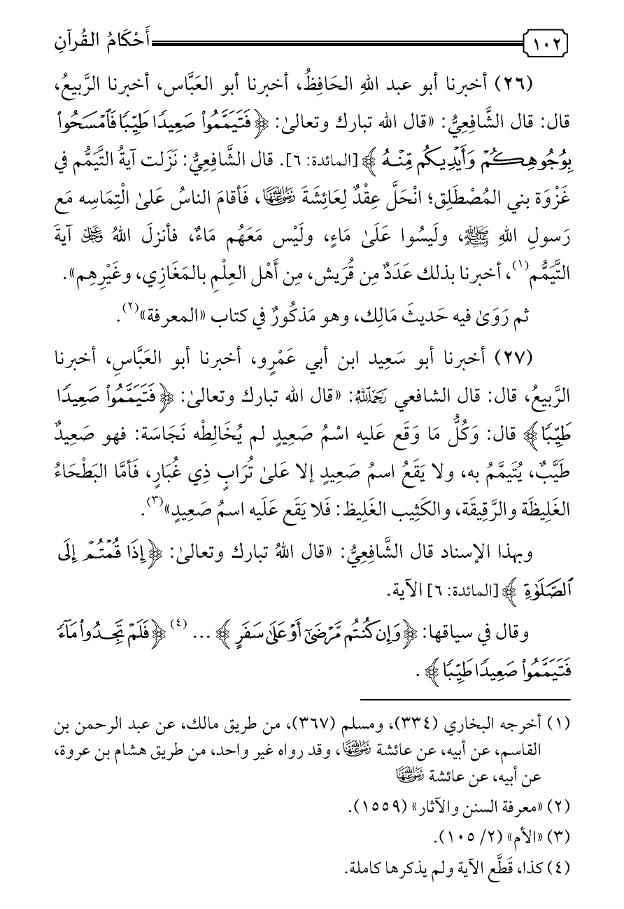 (٢٦) أخبرنا أبو عبد اللهِ الحَافِظُ، أخبرنا أبو العَبَّاس، أخبرنا الرَّبيعُ، قال: قال الشَّافِعِيُّ: «قال الله تبارك وتعالى: {فَتَيَمَّمُوا صَعِيدًا طَيِّبًا فَامْسَحُوا بِوُجُوهِكُمْ وَأَيْدِيكُمْ مِنْهُ} [المائدة: ٦]. قال الشَّافِعِيُّ: نَزَلت آيةُ التَّيَمُّم في غَزْوَة بني المُصْطَلِق؛ انْحَلَّ عِقْدٌ لِعَائِشَةَ - رضي الله عنها -، فَأقامَ الناسُ عَلى الْتِمَاسِه مَع رَسولِ اللهِ - صلى الله عليه وسلم -، ولَيسُوا عَلَى مَاءٍ، ولَيْس مَعَهُم مَاءٌ، فأنزلَ اللهُ - عز وجل - آيةَ التَّيَمُّم (¬١)، أخبرنا بذلك عَدَدٌ مِن قُرَيش، مِن أَهْل العِلْمِ بالمَغَازِي، وغَيْرِهِم».