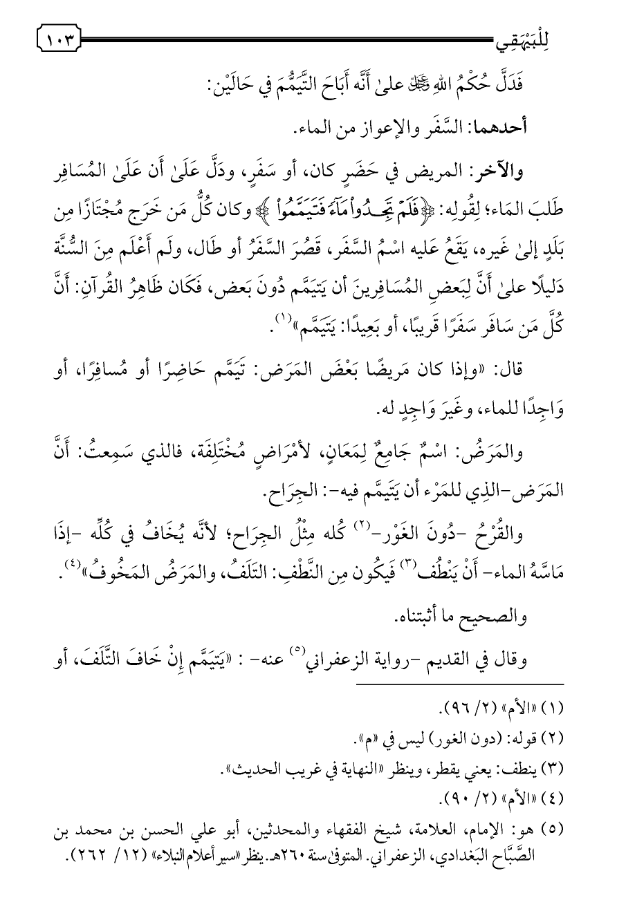 والآخر: المريض في حَضَرٍ كان، أو سَفَرٍ، ودَلَّ عَلَى أَن عَلَى المُسَافِر طَلبَ المَاء؛ لِقُولِه: {فَلَمْ تَجِدُوا مَاءً فَتَيَمَّمُوا} وكان كُلُّ مَن خَرَج مُجْتَازًا مِن بَلَدٍ إلى غَيره، يَقَعُ عَليه اسْمُ السَّفَر، قَصُرَ السَّفَرُ أو طَال، ولَم أَعْلَم مِنَ السُّنَّة دَليلًا على أَنَّ لِبَعضِ المُسَافِرينَ أن يَتيَمَّم دُونَ بَعض، فَكَان ظَاهِرُ القُرآنِ: أَنَّ كُلَّ مَن سَافَر سَفَرًا قَريبًا، أو بَعِيدًا: يَتَيَمَّم» (¬١).