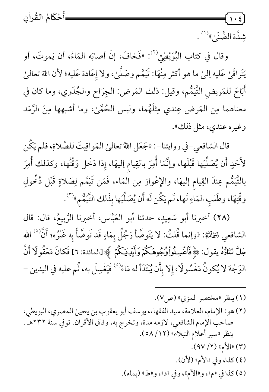 وقال في كتاب البُوَيْطِيِّ (¬٢): «فَخافَ، إنْ أصابَه المَاءُ، أن يَموتَ، أو يَتَراقَى عَليه إلى ما هو أكثر مِنْهَا: تَيَمَّم وصَلَّى، ولا إِعَادة عَليه؛ لأن اللهَ تعالى أَبَاحَ للمَريضِ التَّيَمُّم، وقيل: ذلك المَرض: الجِرَاح والجُدَري، وما كان في معناهما مِن المَرض عِندي مِثلَهُما، وليس الحُمَّى، وما أشبهها مِنَ الرَّمَد وغيره عندي، مثل ذلك».