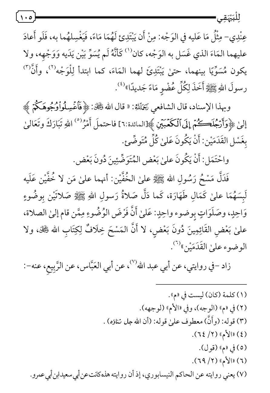 وبهذا الإسناد، قال الشافعي - رحمه الله -: «قال الله - عز وجل -: {فَاغْسِلُوا وُجُوهَكُمْ} إلى {وَأَرْجُلَكُمْ إِلَى الْكَعْبَيْنِ} [المائدة: ٦] فاحتملَ أَمْرُ (¬٥) اللهِ تَبَارَكَ وتَعَالى بِغَسْل القَدَمَيْن: أَنْ يَكُونَ عَلى كُلِّ مُتَوضِّئ.