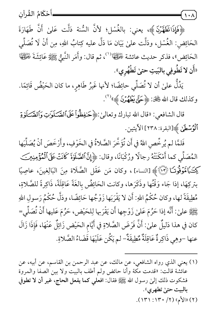 (¬١) يعني الذي رواه الشافعي، عن مالك، عن عبد الرحمن بن القاسم، عن أبيه، عن عائشة قالت: «قدمت مكة وأنا حائض ولم أطف بالبيت ولا بين الصفا والمروة فشكوت ذلك إلى رسول الله - صلى الله عليه وسلم - فقال: افعلي كما يفعل الحاج، غير أن لا تطوفي بالبيت حتى تطهري».