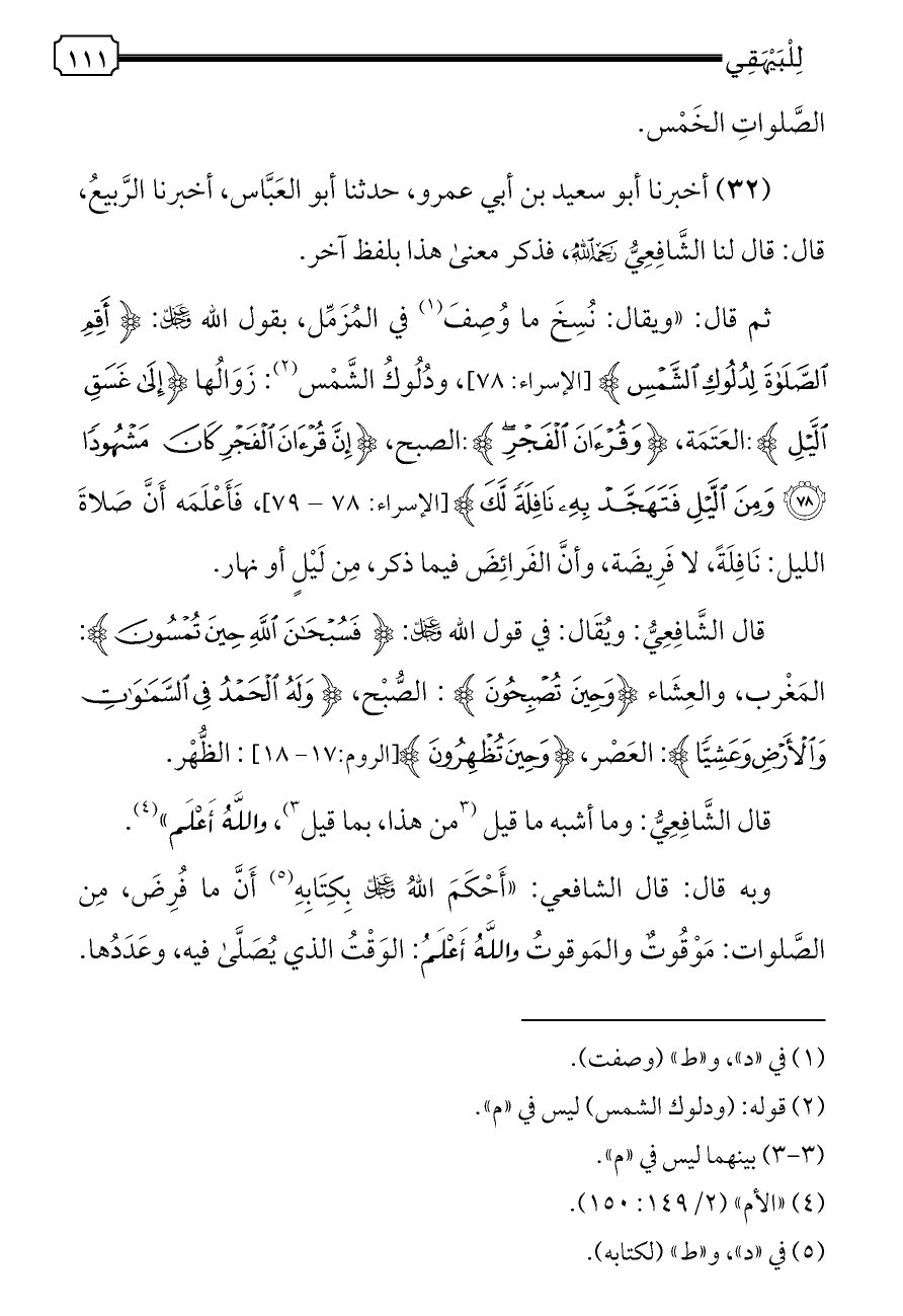 قال الشَّافِعِيُّ: ويُقَال: في قول الله - عز وجل -: {فَسُبْحَانَ اللَّهِ حِينَ تُمْسُونَ}: المَغْرب، والعِشَاء {وَحِينَ تُصْبِحُونَ}: الصُّبْح، {وَلَهُ الْحَمْدُ فِي السَّمَاوَاتِ وَالْأَرْضِ وَعَشِيًّا}: العَصْر، {وَحِينَ تُظْهِرُونَ} [الروم: ١٧ - ١٨]: الظُّهْر.