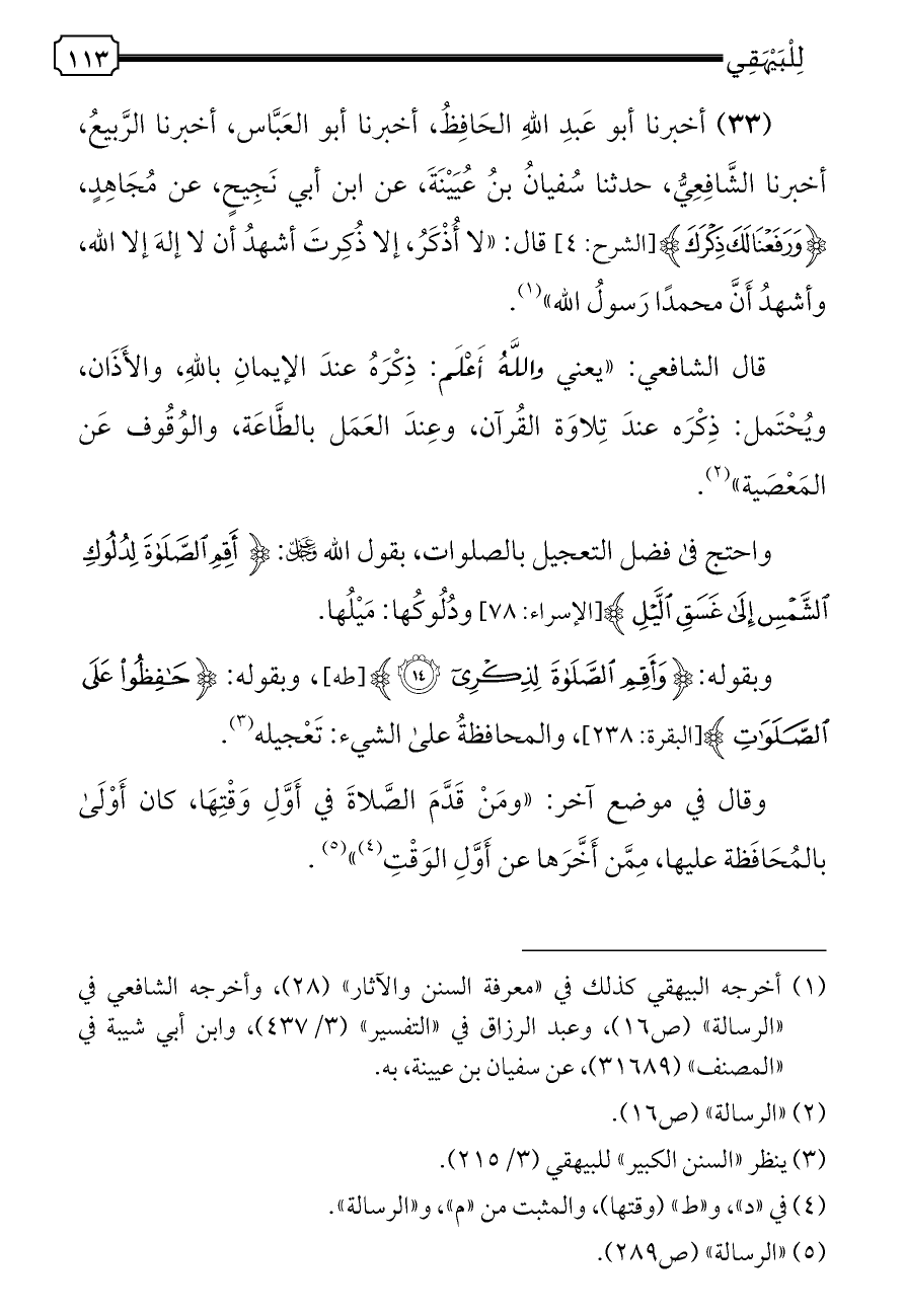 (٣٣) أخبرنا أبو عَبدِ اللهِ الحَافِظُ، أخبرنا أبو العَبَّاس، أخبرنا الرَّبيعُ، أخبرنا الشَّافِعِيُّ، حدثنا سُفيانُ بنُ عُيَيْنَةَ، عن ابن أبي نَجِيحٍ، عن مُجَاهِدٍ، ... {وَرَفَعْنَا لَكَ ذِكْرَكَ} [الشرح: ٤] قال: «لا أُذْكَرُ، إلا ذُكِرتَ أشهدُ أن لا إلهَ إلا الله، وأشهدُ أَنَّ محمدًا رَسولُ الله» (¬١).