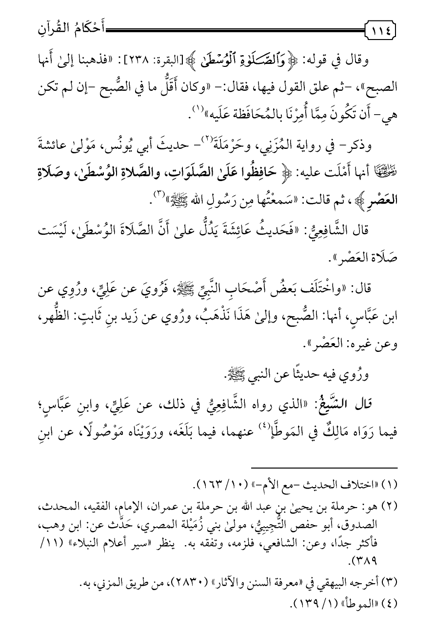 وذكر- في رواية المُزَنِي، وحَرْمَلَةَ (¬٢) - حديثَ أبي يُونُس، مَوْلى عائشةَ - رضي الله عنها - أنها أَمْلَت عليه: {حَافِظُوا عَلَى الصَّلَوَاتِ، والصَّلاةِ الوُسْطَى، وصَلَاةِ العَصْرِ}، ثم قالت: «سَمعْتُها مِن رَسُولِ الله - صلى الله عليه وسلم -» (¬٣).