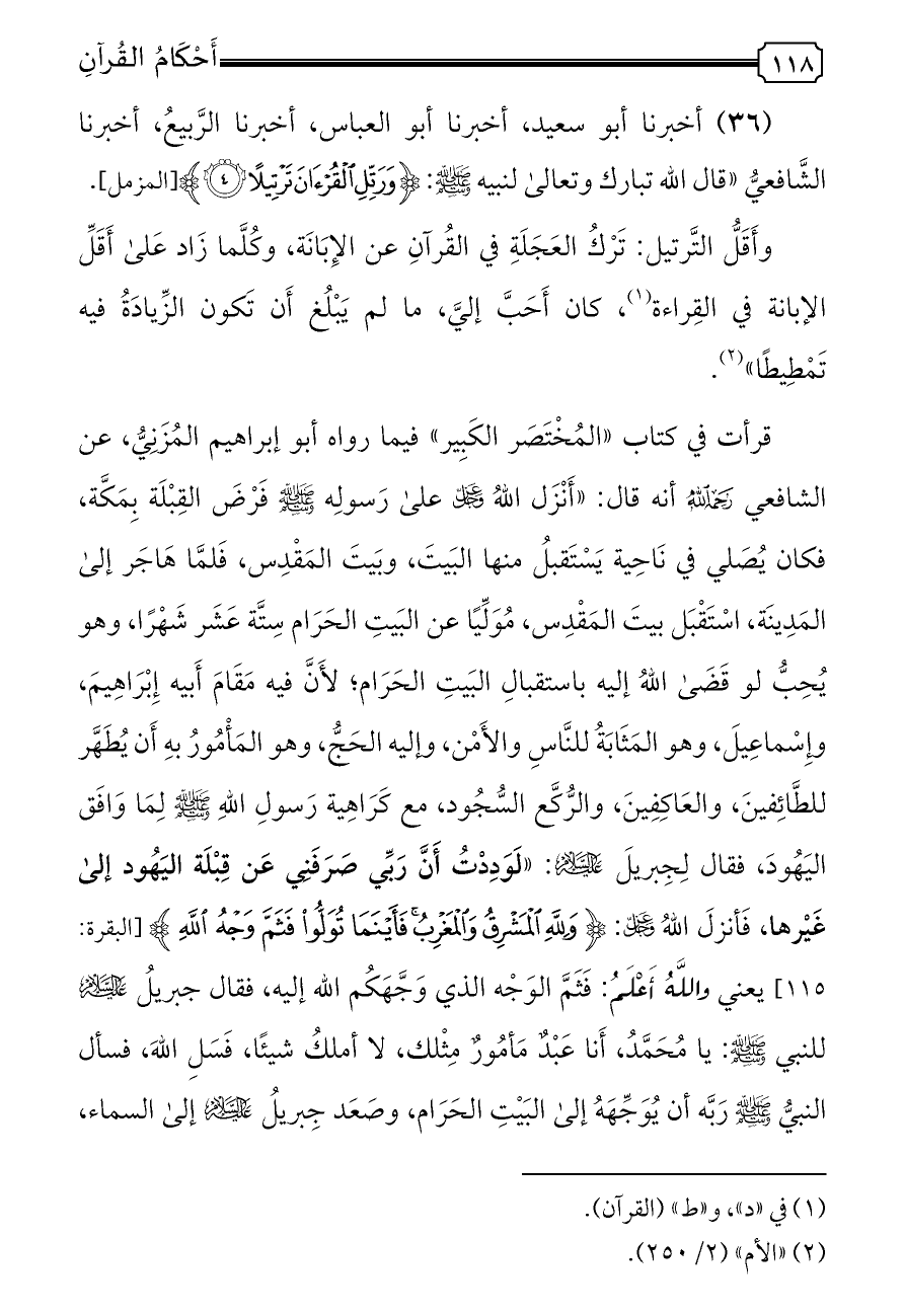 (٣٦) أخبرنا أبو سعيد، أخبرنا أبو العباس، أخبرنا الرَّبيعُ، أخبرنا الشَّافعيُّ «قال الله تبارك وتعالى لنبيه - صلى الله عليه وسلم -: {وَرَتِّلِ الْقُرْآنَ تَرْتِيلًا (٤)} [المزمل].