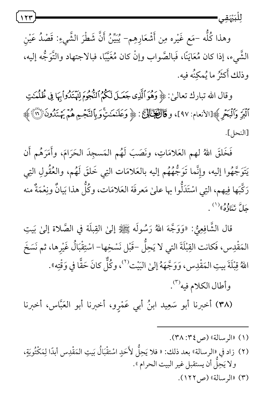 (¬٢) زاد في «الرسالة» بعد ذلك: «فلا يَحِلُّ لأَحَدٍ اسْتقْبَالُ بَيتِ المَقْدِس أبدًا لِمَكْتُوبَةٍ، ولا يَحِلُّ أن يستقبل غير البيت الحرام».