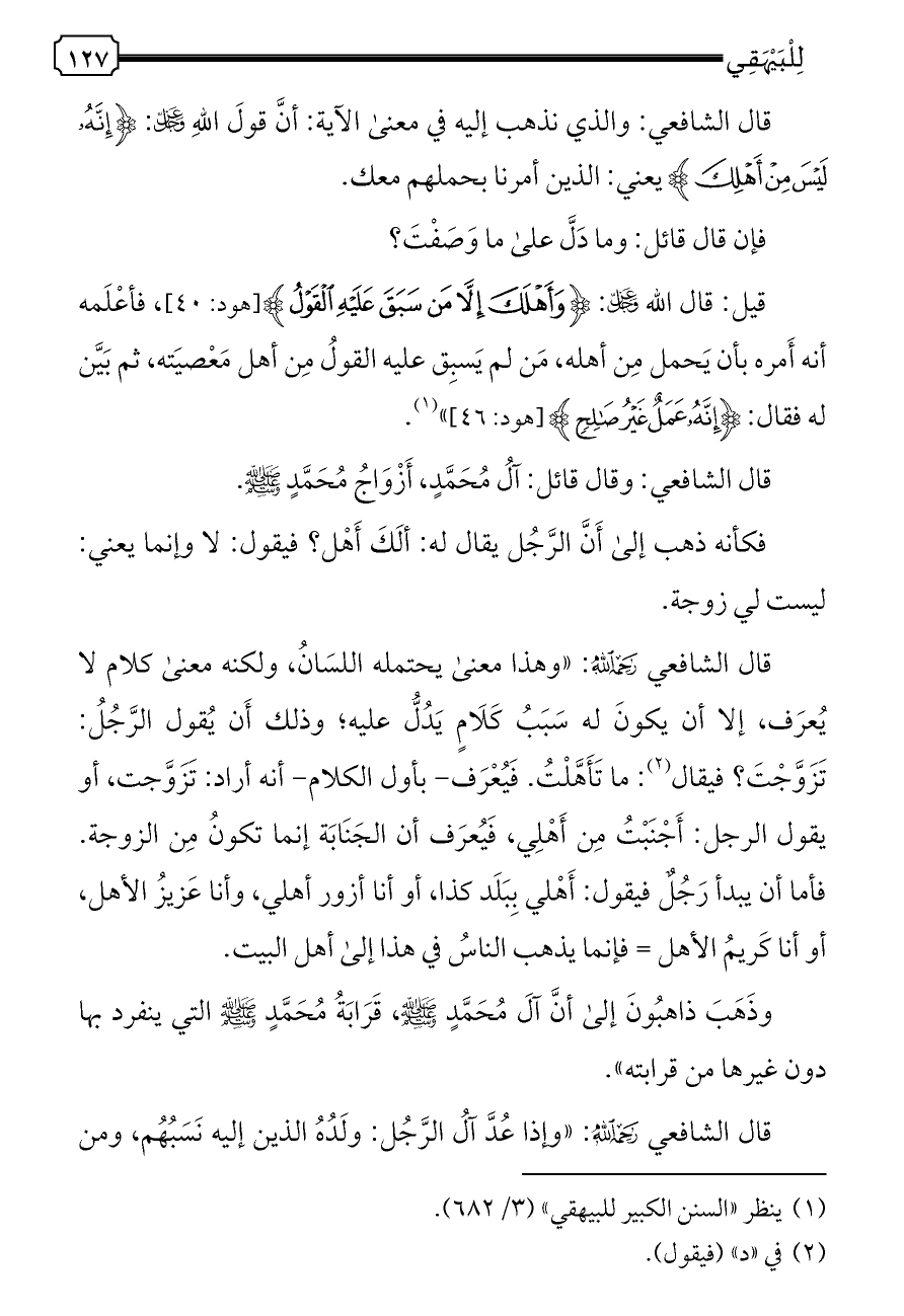 قال الشافعي - رحمه الله -: «وهذا معنى يحتمله اللسَانُ، ولكنه معنى كلام لا يُعرَف، إلا أن يكونَ له سَبَبُ كَلَامٍ يَدُلُّ عليه؛ وذلك أَن يُقول الرَّجُلُ: تَزَوَّجْتَ؟ فيقال (¬٢): ما تَأَهَّلْتُ. فَيُعْرَف- بأول الكلام- أنه أراد: تَزَوَّجت، أو يقول الرجل: أَجْنَبْتُ مِن أَهْلِي، فَيُعرَف أن الجَنَابَة إنما تكونُ مِن الزوجة. فأما أن يبدأ رَجُلٌ فيقول: أَهْلي بِبَلَد كذا، أو أنا أزور أهلي، وأنا عَزيزُ الأهل، أو أنا كَريمُ الأهل = فإنما يذهب الناسُ في هذا إلى أهل البيت.