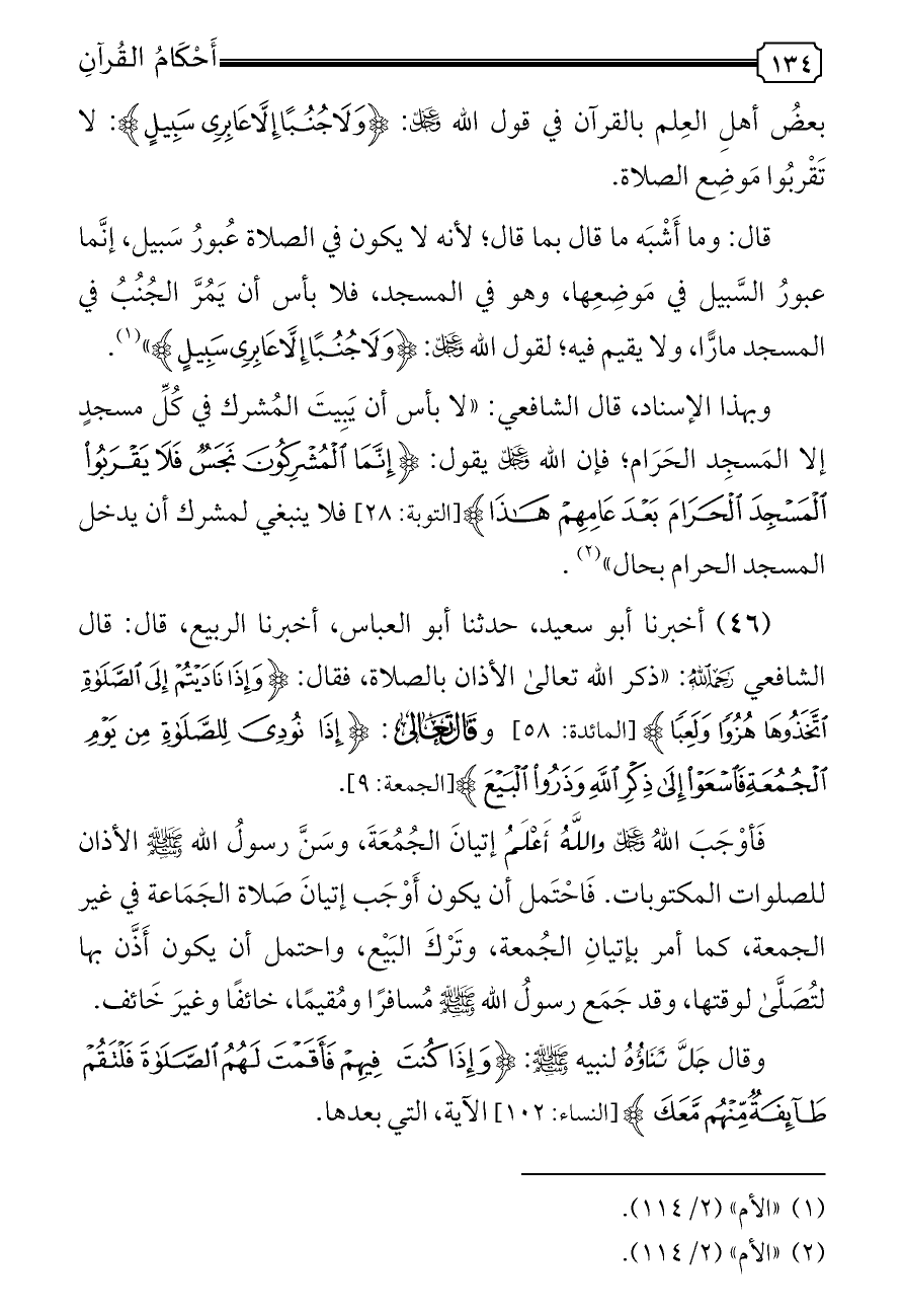 (٤٦) أخبرنا أبو سعيد، حدثنا أبو العباس، أخبرنا الربيع، قال: قال الشافعي - رحمه الله -: «ذكر الله تعالى الأذان بالصلاة، فقال: {وَإِذَا نَادَيْتُمْ إِلَى الصَّلَاةِ اتَّخَذُوهَا هُزُوًا وَلَعِبًا} [المائدة: ٥٨] وقال تعالى: {إِذَا نُودِيَ لِلصَّلَاةِ مِنْ يَوْمِ الْجُمُعَةِ فَاسْعَوْا إِلَى ذِكْرِ اللَّهِ وَذَرُوا الْبَيْعَ} [الجمعة: ٩].