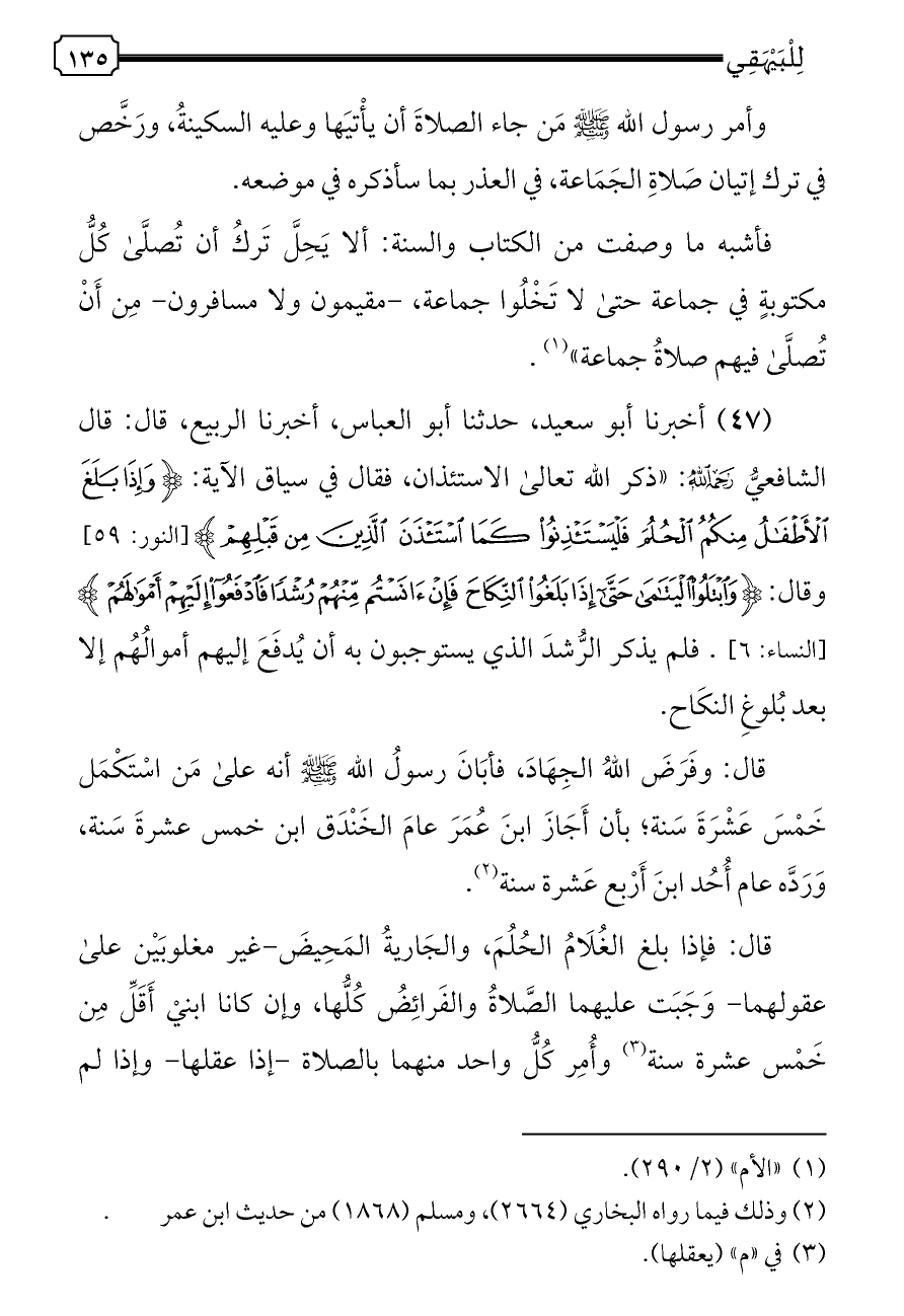 (٤٧) أخبرنا أبو سعيد، حدثنا أبو العباس، أخبرنا الربيع، قال: قال الشافعيُّ - رحمه الله -: «ذكر الله تعالى الاستئذان، فقال في سياق الآية: {وَإِذَا بَلَغَ الْأَطْفَالُ مِنْكُمُ الْحُلُمَ فَلْيَسْتَأْذِنُوا كَمَا اسْتَأْذَنَ الَّذِينَ مِنْ قَبْلِهِمْ} [النور: ٥٩] وقال: {وَابْتَلُوا الْيَتَامَى حَتَّى إِذَا بَلَغُوا النِّكَاحَ فَإِنْ آنَسْتُمْ مِنْهُمْ رُشْدًا فَادْفَعُوا إِلَيْهِمْ أَمْوَالَهُمْ} [النساء: ٦]. فلم يذكر الرُّشدَ الذي يستوجبون به أن يُدفَعَ إليهم أموالُهُم إلا بعد بُلوغِ النكَاح.
