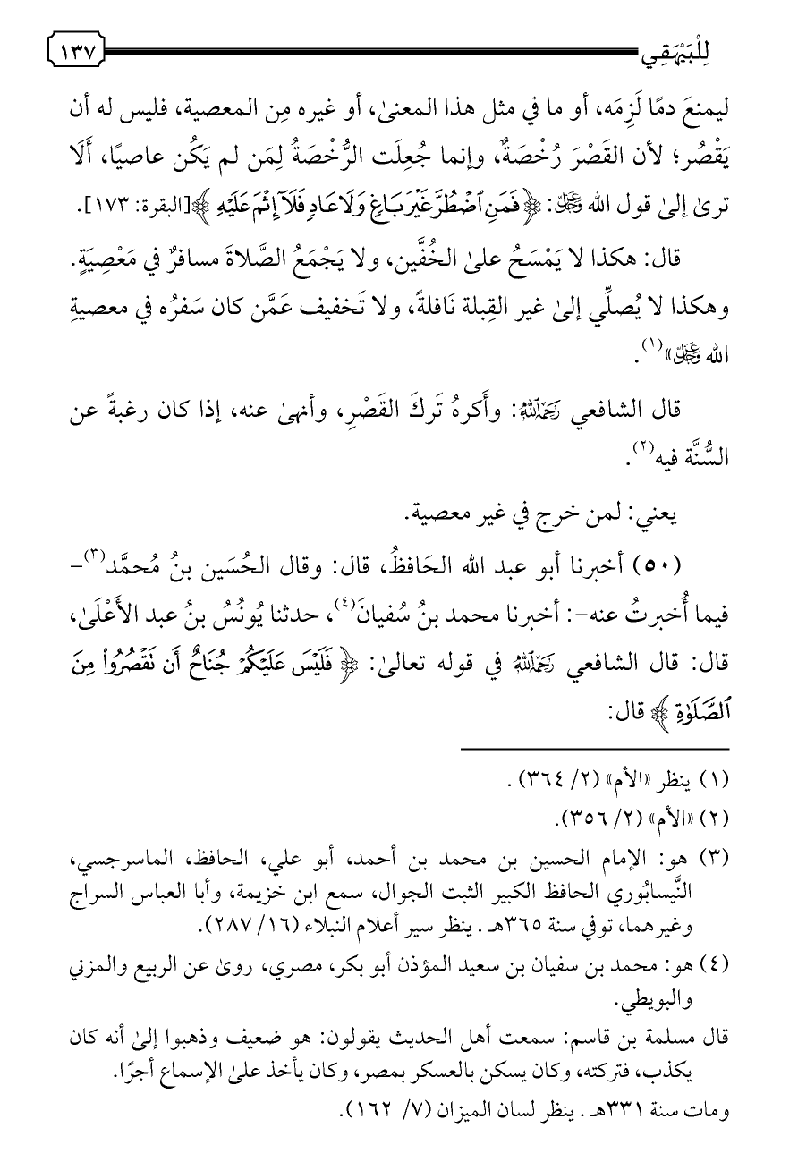 (٥٠) أخبرنا أبو عبد الله الحَافظُ، قال: وقال الحُسَين بنُ مُحمَّد (¬٣) - فيما أُخبرتُ عنه-: أخبرنا محمد بنُ سُفيانَ (¬٤)، حدثنا يُونُسُ بنُ عبد الأَعْلَى، قال: قال الشافعي - رحمه الله - في قوله تعالى: {فَلَيْسَ عَلَيْكُمْ جُنَاحٌ أَنْ تَقْصُرُوا مِنَ الصَّلَاةِ} قال: