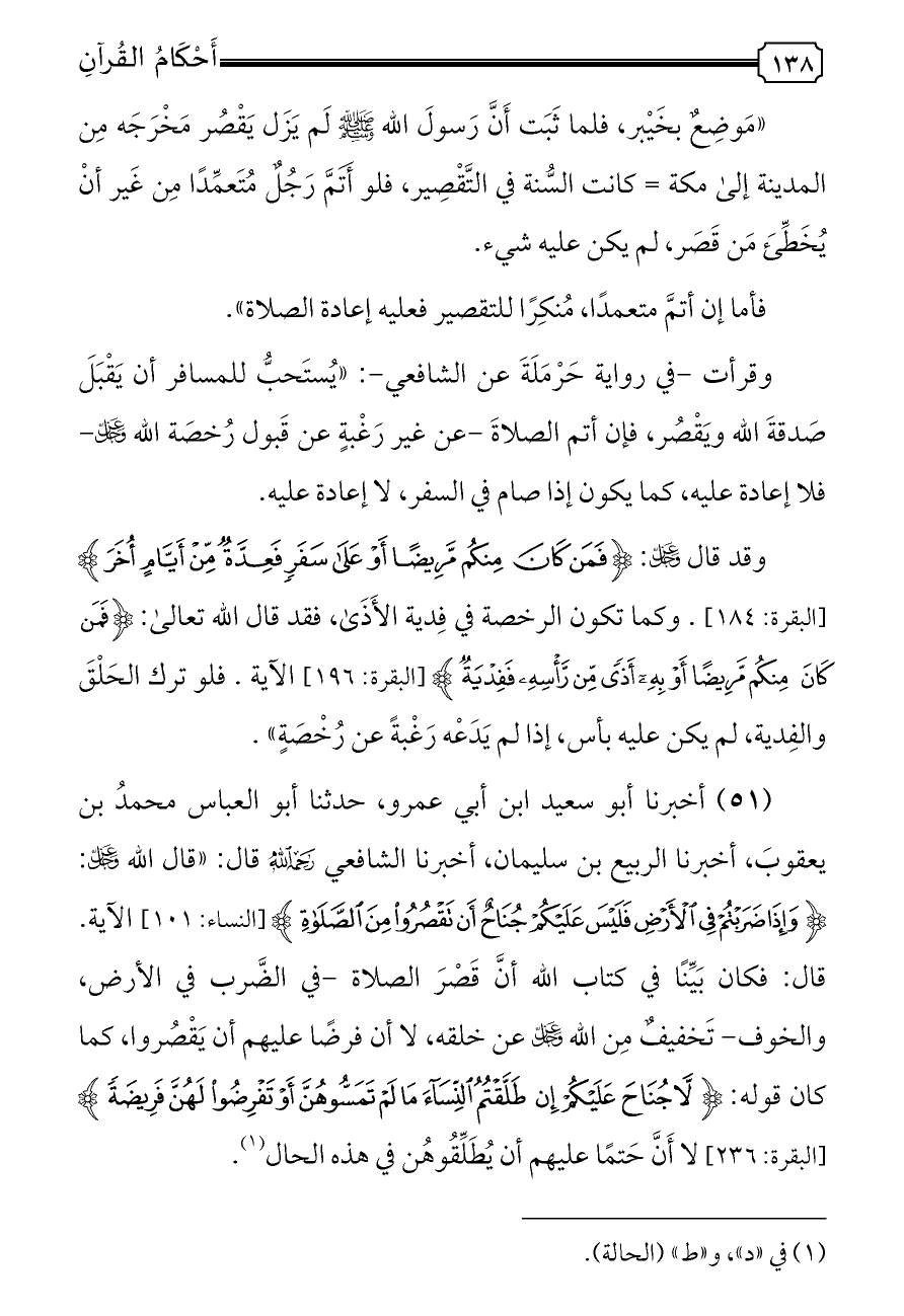 (٥١) أخبرنا أبو سعيد ابن أبي عمرو، حدثنا أبو العباس محمدُ بن يعقوبَ، أخبرنا الربيع بن سليمان، أخبرنا الشافعي - رحمه الله - قال: «قال الله - عز وجل -: {وَإِذَا ضَرَبْتُمْ فِي الْأَرْضِ فَلَيْسَ عَلَيْكُمْ جُنَاحٌ أَنْ تَقْصُرُوا مِنَ الصَّلَاةِ} [النساء: ١٠١] ... الآية. قال: فكان بَيِّنًا في كتاب الله أنَّ قَصْرَ الصلاة -في الضَّرب في الأرض، والخوف- تَخفيفٌ مِن الله - عز وجل - عن خلقه، لا أن فرضًا عليهم أن يَقْصُروا، كما كان قوله: {لَا جُنَاحَ عَلَيْكُمْ إِنْ طَلَّقْتُمُ النِّسَاءَ مَا لَمْ تَمَسُّوهُنَّ أَوْ تَفْرِضُوا لَهُنَّ فَرِيضَةً} [البقرة: ٢٣٦] لا أَنَّ حَتمًا عليهم أن يُطَلِّقُوهُن في هذه الحال (¬١).