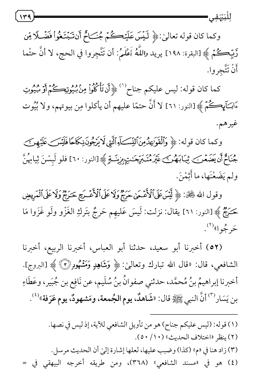 (٥٢) أخبرنا أبو سعيد، حدثنا أبو العباس، أخبرنا الربيع، أخبرنا الشافعي، قال: «قال الله تبارك وتعالى: {وَشَاهِدٍ وَمَشْهُودٍ (٣)} [البروج]. أخبرنا إبراهيمُ بنُ مُحمَّد، حدثني صفوانُ بنُ سُلَيم، عن نَافِع بن جُبَير، وعَطَاءِ بن يَسَار (¬٣) أنَّ النبي - صلى الله عليه وسلم - قال: «شَاهدٌ، يوم الجُمعة، ومَشهودٌ، يوم عَرَفة» (¬٤).