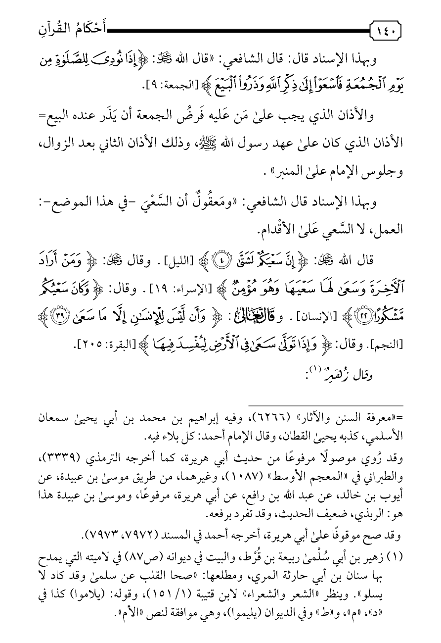 وبهذا الإسناد قال الشافعي: «ومَعقُولٌ أن السَّعْيَ -في هذا الموضع-: العمل، لا السَّعي عَلى الأقْدام.