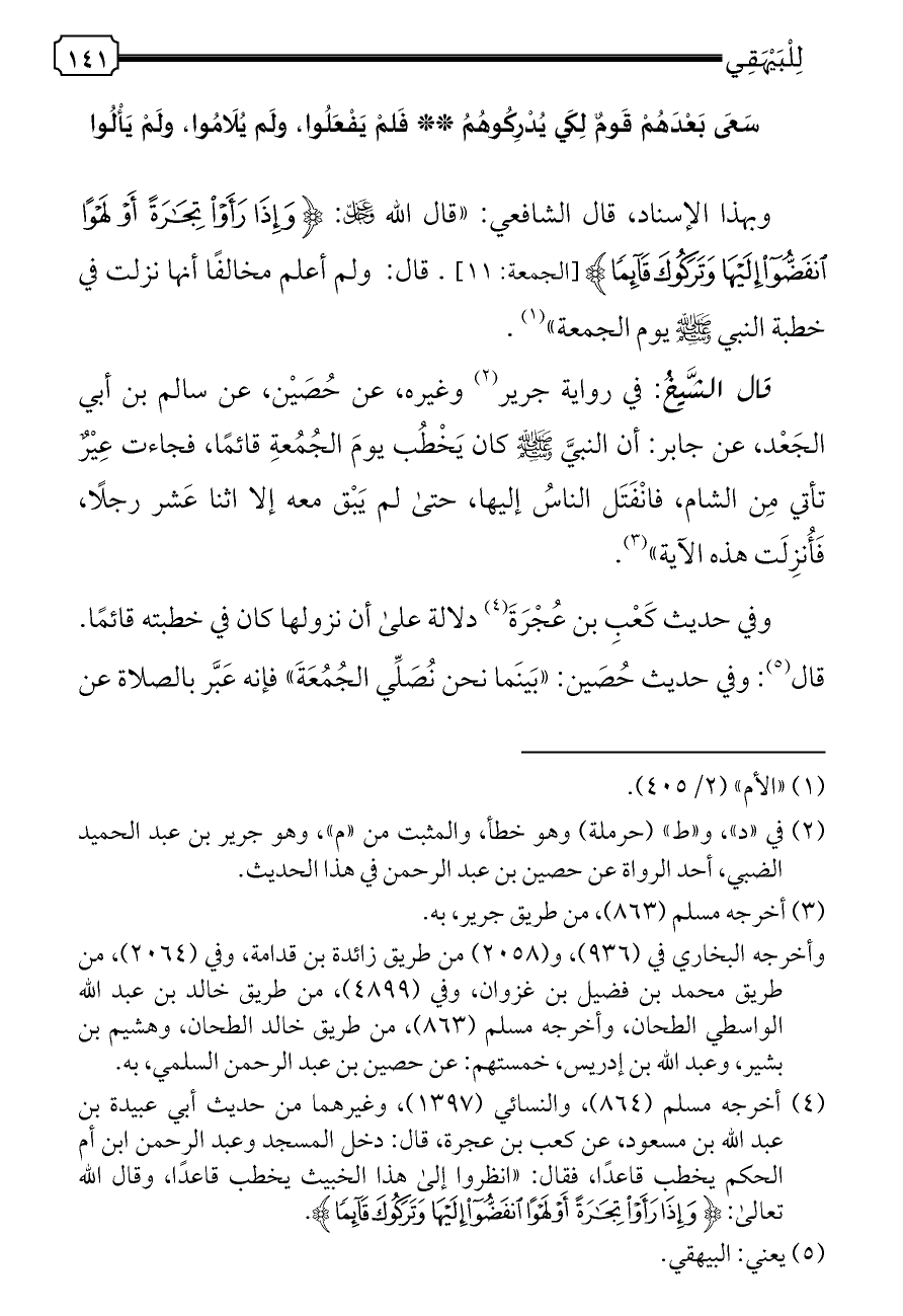 وبهذا الإسناد، قال الشافعي: «قال الله - عز وجل -: {وَإِذَا رَأَوْا تِجَارَةً أَوْ لَهْوًا انْفَضُّوا إِلَيْهَا وَتَرَكُوكَ قَائِمًا} [الجمعة: ١١]. قال: ولم أعلم مخالفًا أنها نزلت في خطبة النبي - صلى الله عليه وسلم - يوم الجمعة» (¬١).