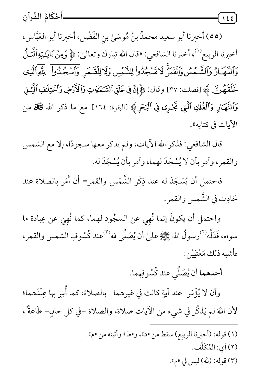 (٥٥) أخبرنا أبو سعيد محمدُ بنُ مُوسَى بنِ الفَضْل، أخبرنا أبو العَبَّاس، أخبرنا الربيع (¬١)، أخبرنا الشافعي: «قال الله تبارك وتعالى: {وَمِنْ آيَاتِهِ اللَّيْلُ وَالنَّهَارُ وَالشَّمْسُ وَالْقَمَرُ لَا تَسْجُدُوا لِلشَّمْسِ وَلَا لِلْقَمَرِ وَاسْجُدُوا لِلَّهِ الَّذِي خَلَقَهُنَّ} [فصلت: ٣٧] وقال: {إِنَّ فِي خَلْقِ السَّمَاوَاتِ وَالْأَرْضِ وَاخْتِلَافِ اللَّيْلِ وَالنَّهَارِ وَالْفُلْكِ الَّتِي تَجْرِي فِي الْبَحْرِ} [البقرة: ١٦٤] مع ما ذكر الله - عز وجل - من الآيات في كتابه».