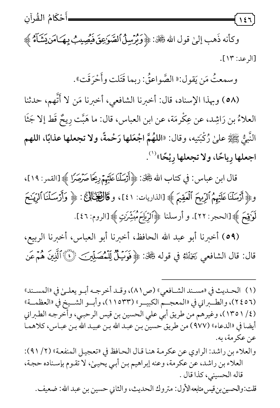 (٥٨) وبهذا الإسناد، قال: أخبرنا الشافعي، أخبرنا مَن لا أَتَّهم، حدثنا العلاءُ بن رَاشِد، عن عِكْرمَة، عن ابن العباس، قال: ما هَبَّت رِيحٌ قَط إلا جَثَا النَّبيُّ - صلى الله عليه وسلم - على رُكْبَتيه، وقال: «اللهُمَّ اجْعَلها رَحْمةً، ولا تجعلها عذابًا، اللهم اجعلها رِياحًا، ولا تجعلها رِيْحًا» (¬١).