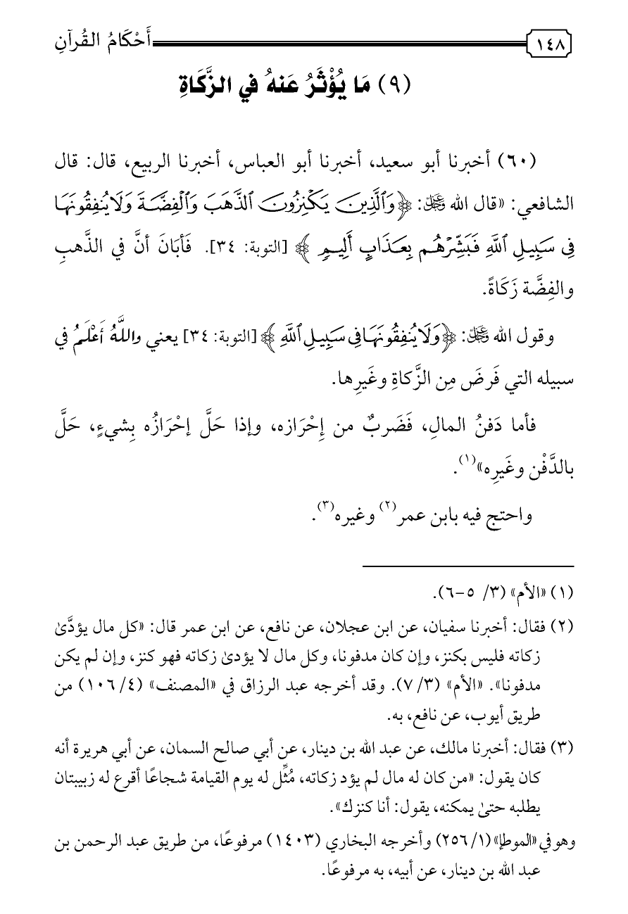 (٦٠) أخبرنا أبو سعيد، أخبرنا أبو العباس، أخبرنا الربيع، قال: قال الشافعي: «قال الله - عز وجل -: {وَالَّذِينَ يَكْنِزُونَ الذَّهَبَ وَالْفِضَّةَ وَلَا يُنْفِقُونَهَا فِي سَبِيلِ اللَّهِ فَبَشِّرْهُمْ بِعَذَابٍ أَلِيمٍ} [التوبة: ٣٤]. فَأبَانَ أنَّ في الذَّهبِ والفِضَّة زَكَاةً.