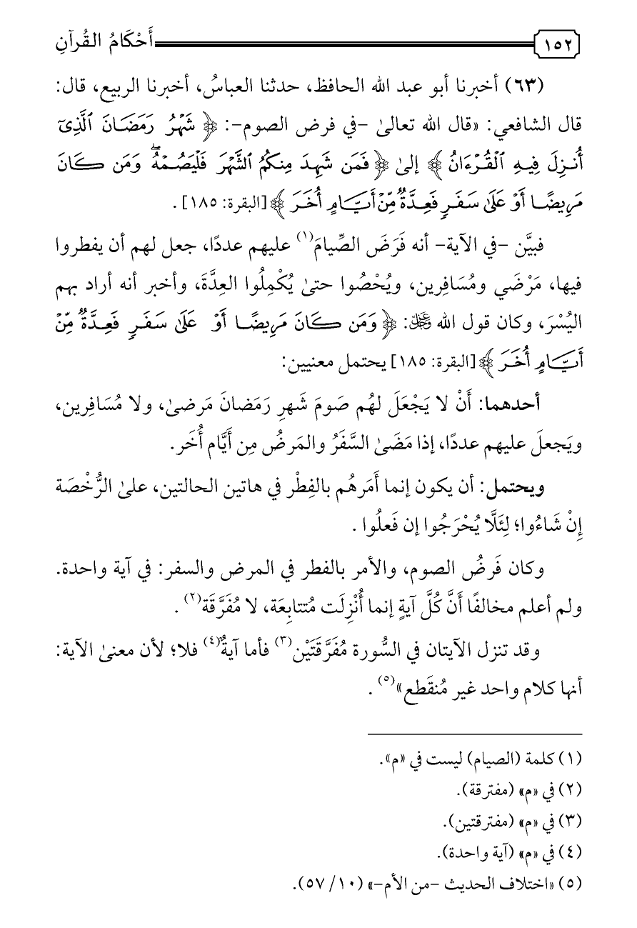 (٦٣) أخبرنا أبو عبد الله الحافظ، حدثنا العباسُ، أخبرنا الربيع، قال: قال الشافعي: «قال الله تعالى -في فرض الصوم-: {شَهْرُ رَمَضَانَ الَّذِي أُنْزِلَ فِيهِ الْقُرْآنُ} إلى {فَمَنْ شَهِدَ مِنْكُمُ الشَّهْرَ فَلْيَصُمْهُ وَمَنْ كَانَ مَرِيضًا أَوْ عَلَى سَفَرٍ فَعِدَّةٌ مِنْ أَيَّامٍ أُخَرَ} [البقرة: ١٨٥].
