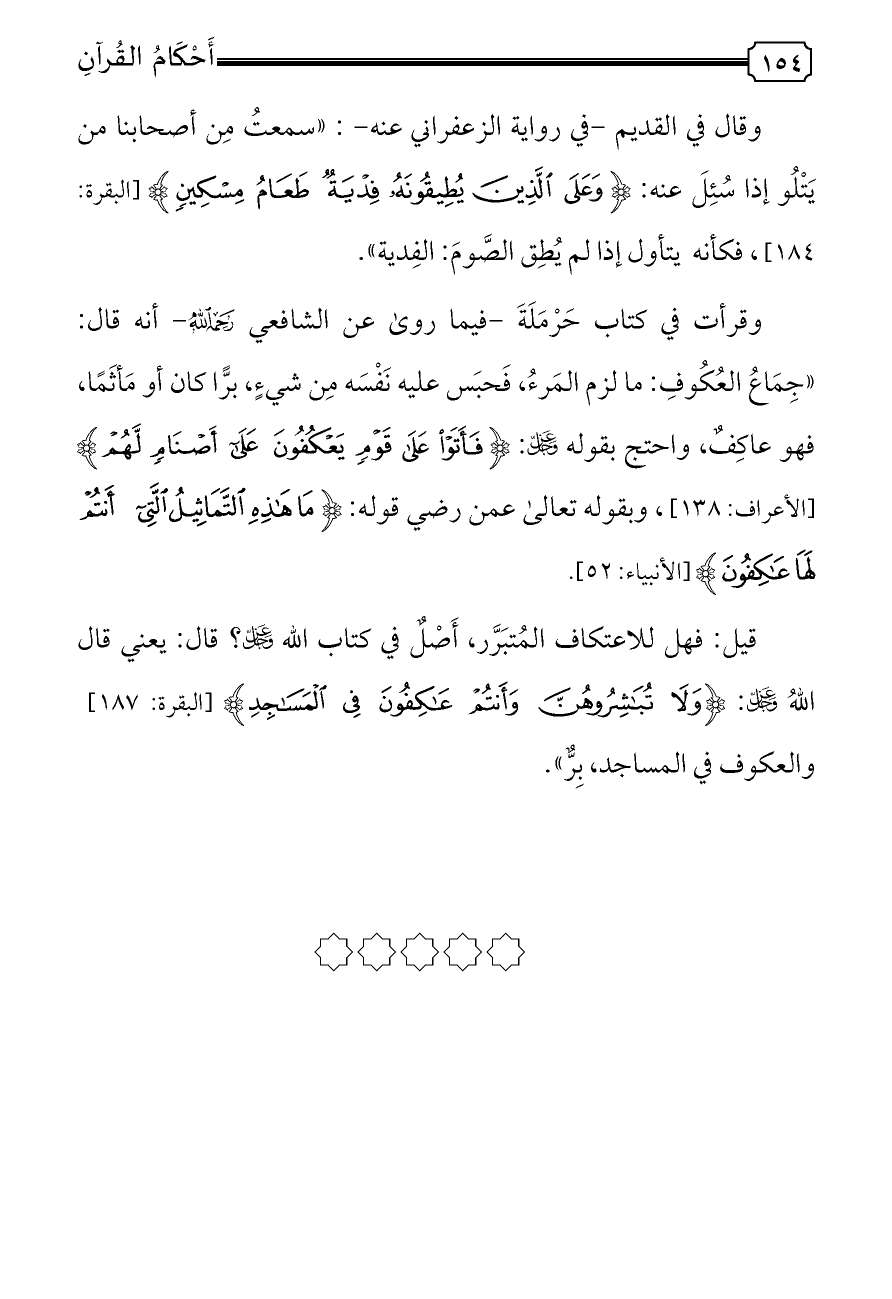 قيل: فهل للاعتكاف المُتبَرَّر، أَصْلٌ في كتاب الله - عز وجل -؟ قال: يعني قال اللهُ - عز وجل -: {وَلَا تُبَاشِرُوهُنَّ وَأَنْتُمْ عَاكِفُونَ فِي الْمَسَاجِدِ} [البقرة: ١٨٧] والعكوف في المساجد، بِرٌّ».