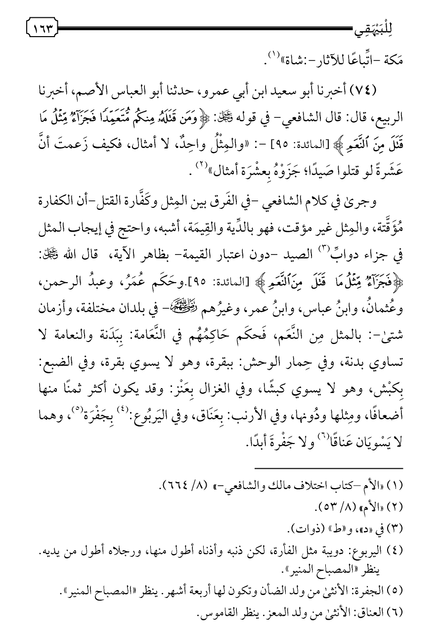 (٧٤) أخبرنا أبو سعيد ابن أبي عمرو، حدثنا أبو العباس الأصم، أخبرنا الربيع، قال: قال الشافعي- في قوله - عز وجل -: {وَمَنْ قَتَلَهُ مِنْكُمْ مُتَعَمِّدًا فَجَزَاءٌ مِثْلُ مَا قَتَلَ مِنَ النَّعَمِ} [المائدة: ٩٥]-: «والمِثْلُ واحِدٌ، لا أمثال، فكيف زَعمتَ أنَّ عَشَرةً لو قتلوا صَيدًا؛ جَزَوْهُ بِعشْرَة أمثال» (¬٢).