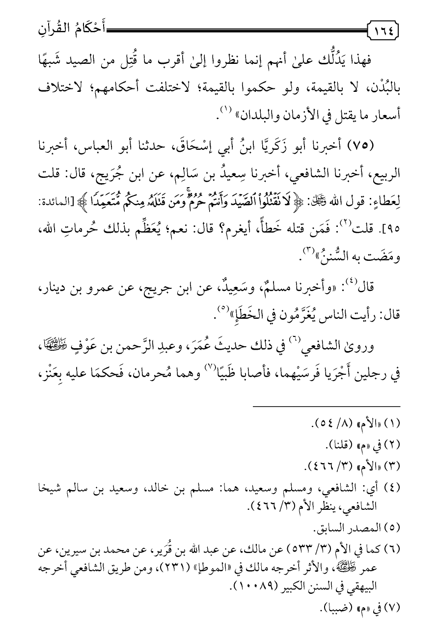(٧٥) أخبرنا أبو زَكَريَّا ابنُ أبي إسْحَاقَ، حدثنا أبو العباس، أخبرنا الربيع، أخبرنا الشافعي، أخبرنا سِعيدُ بن سَالِم، عن ابن جُرَيج، قال: قلت لِعَطاءٍ: قول الله - عز وجل -: {لَا تَقْتُلُوا الصَّيْدَ وَأَنْتُمْ حُرُمٌ وَمَنْ قَتَلَهُ مِنْكُمْ مُتَعَمِّدًا} [المائدة: ٩٥]. قلت (¬٢): فَمَن قتله خَطأً، أيغرم؟ قال: نعم؛ يُعَظِّم بذلك حُرماتِ الله، ومَضَت به السُّننُ» (¬٣).