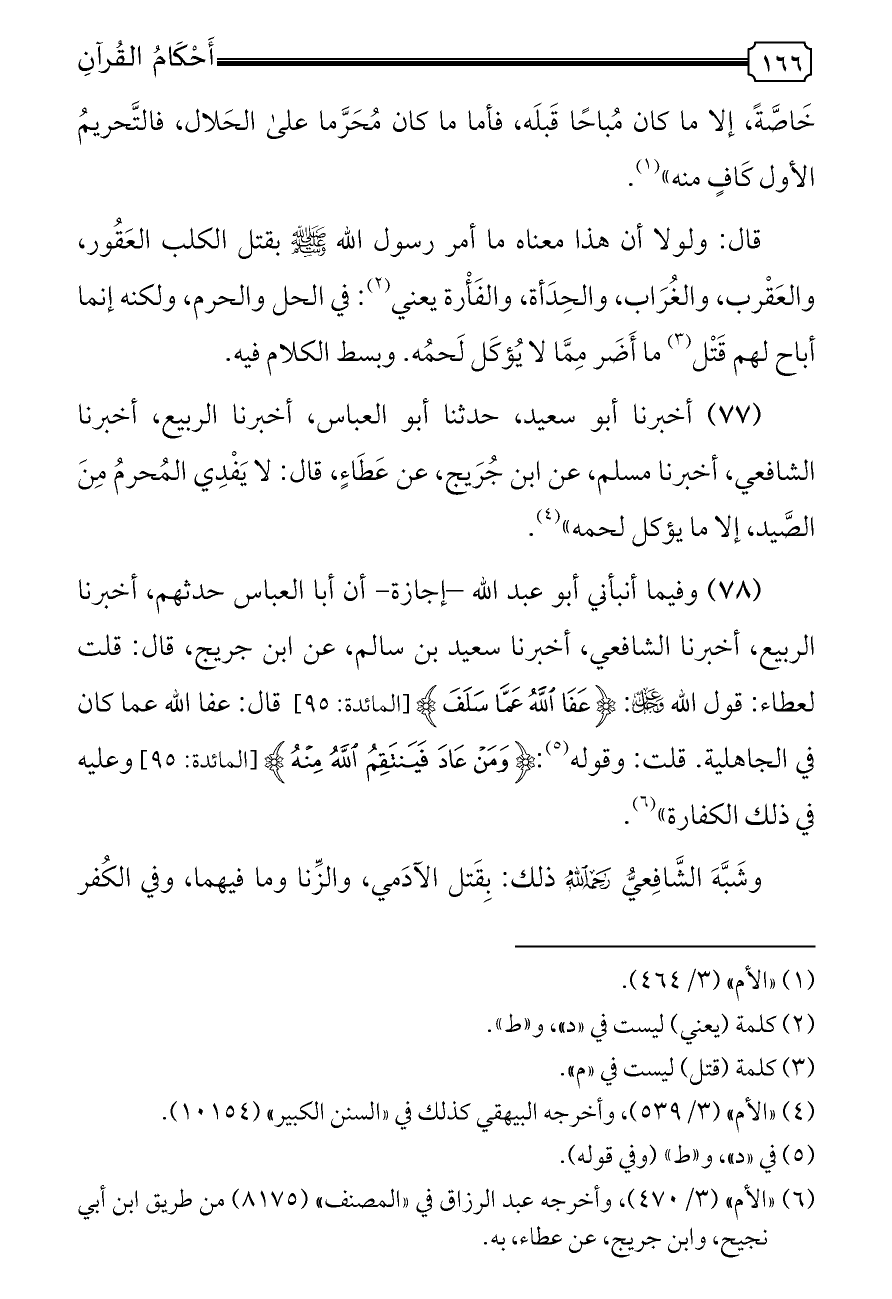 (٧٨) وفيما أنبأني أبو عبد الله -إجازة- أن أبا العباس حدثهم، أخبرنا الربيع، أخبرنا الشافعي، أخبرنا سعيد بن سالم، عن ابن جريج، قال: قلت لعطاء: قول الله - عز وجل -: {عَفَا اللَّهُ عَمَّا سَلَفَ} [المائدة: ٩٥] قال: عفا الله عما كان في الجاهلية. قلت: وقوله (¬٥): {وَمَنْ عَادَ فَيَنْتَقِمُ اللَّهُ مِنْهُ} [المائدة: ٩٥] وعليه في ذلك الكفارة» (¬٦).