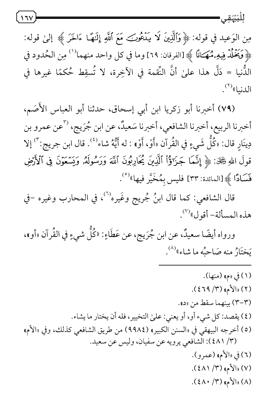 (٧٩) أخبرنا أبو زكريا ابن أبي إسحاق، حدثنا أبو العباس الأَصَم، أخبرنا الربيع، أخبرنا الشافعي، أخبرنا سَعيدٌ، عن ابن جُرَيج، [عن عمرو بن دِينَارٍ قال: «كُلُّ شَيءٍ في القُرآن «أَوْ، أَوْ»: له أَيُّهُ شاء (¬٤). قال ابن جريج: ] (¬٣) إلا قولَ اللهِ - عز وجل -: {إِنَّمَا جَزَاءُ الَّذِينَ يُحَارِبُونَ اللَّهَ وَرَسُولَهُ وَيَسْعَوْنَ فِي الْأَرْضِ فَسَادًا} [المائدة: ٣٣] فليس بِمُخَيَّر فيها» (¬٥).