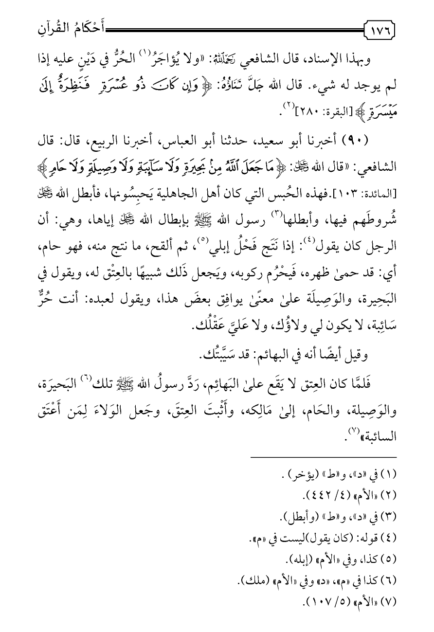 (٩٠) أخبرنا أبو سعيد، حدثنا أبو العباس، أخبرنا الربيع، قال: قال الشافعي: «قال الله - عز وجل -: {مَا جَعَلَ اللَّهُ مِنْ بَحِيرَةٍ وَلَا سَائِبَةٍ وَلَا وَصِيلَةٍ وَلَا حَامٍ} [المائدة: ١٠٣].فهذه الحُبس التي كان أهل الجاهلية يَحبِسُونها، فأبطل الله - عز وجل - شُروطَهم فيها، وأبطلها (¬٣) رسول الله - صلى الله عليه وسلم - بإبطال الله - عز وجل - إياها، وهي: أن الرجل كان يقول (¬٤): إذا نَتَج فَحْلُ إبلي (¬٥)، ثم ألقح، ما نتج منه، فهو حام، أي: قد حمى ظهره، فَيحْرُم ركوبه، ويَجعل ذَلك شبيهًا بالعِتْق له، ويقول في البَحِيرة، والوَصِيلَة على معنًى يوافِق بعضَ هذا، ويقول لعبده: أنت حُرٌّ سَائِبة، لا يكون لي ولاؤُك، ولا عَليَّ عَقْلُك.
