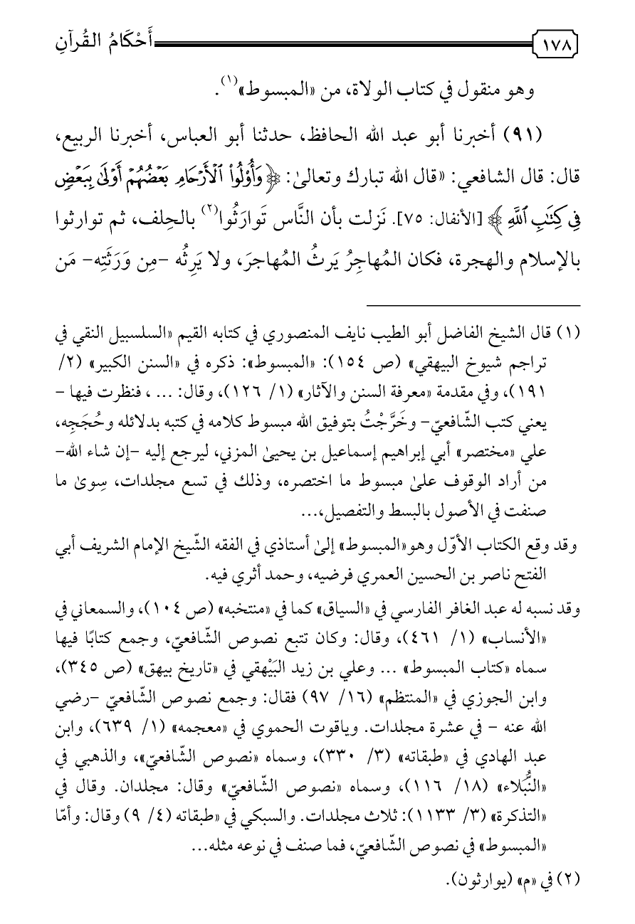 (٩١) أخبرنا أبو عبد الله الحافظ، حدثنا أبو العباس، أخبرنا الربيع، قال: قال الشافعي: «قال الله تبارك وتعالى: {وَأُولُو الْأَرْحَامِ بَعْضُهُمْ أَوْلَى بِبَعْضٍ فِي كِتَابِ اللَّهِ} [الأنفال: ٧٥]. نَزلت بأن النَّاس تَوارَثُوا (¬٢) بالحِلف، ثم توارثوا بالإسلام والهجرة، فكان المُهاجِرُ يَرثُ المُهاجرَ، ولا يَرِثُه -مِن وَرَثَتِه- مَن