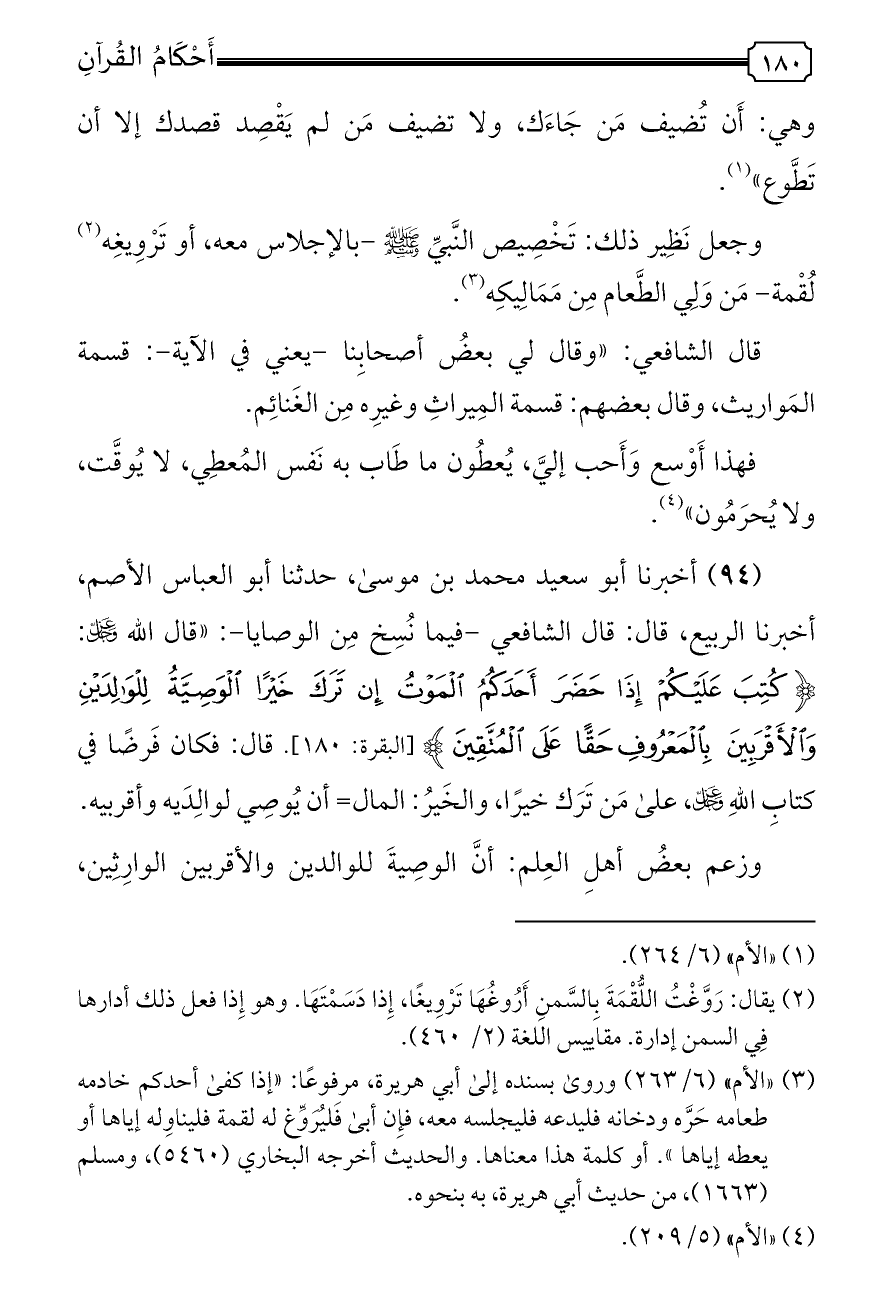 (٩٤) أخبرنا أبو سعيد محمد بن موسى، حدثنا أبو العباس الأصم، أخبرنا الربيع، قال: قال الشافعي -فيما نُسِخ مِن الوصايا-: «قال الله - عز وجل -: ... {كُتِبَ عَلَيْكُمْ إِذَا حَضَرَ أَحَدَكُمُ الْمَوْتُ إِنْ تَرَكَ خَيْرًا الْوَصِيَّةُ لِلْوَالِدَيْنِ وَالْأَقْرَبِينَ بِالْمَعْرُوفِ حَقًّا عَلَى الْمُتَّقِينَ} [البقرة: ١٨٠]. قال: فكان فَرضًا في كتابِ اللهِ - عز وجل -، على مَن تَرَك خيرًا، والخَيرُ: المال= أن يُوصِي لوالِدَيه وأقربيه.