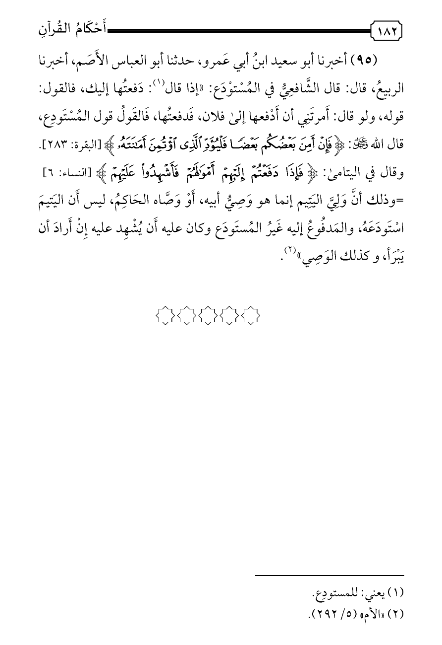 (٩٥) أخبرنا أبو سعيد ابنُ أبي عَمرو، حدثنا أبو العباس الأَصَم، أخبرنا الربيعُ، قال: قال الشَّافعِيُّ في المُسْتوْدَع: «إذا قال (¬١): دَفعتُها إليك، فالقول: قوله، ولو قال: أَمرتَنِي أن أَدْفعها إلى فلان، فَدفعتُها، فَالقَولُ قول المُسْتَودِع، قال الله - عز وجل -: {فَإِنْ أَمِنَ بَعْضُكُمْ بَعْضًا فَلْيُؤَدِّ الَّذِي اؤْتُمِنَ أَمَانَتَهُ} [البقرة: ٢٨٣]. وقال في اليتامى: {فَإِذَا دَفَعْتُمْ إِلَيْهِمْ أَمْوَالَهُمْ فَأَشْهِدُوا عَلَيْهِمْ} [النساء: ٦] =وذلك أنَّ وَلِيَّ اليَتِيم إنما هو وَصِيُّ أبيه، أَوْ وَصَّاه الحَاكِمُ، ليس أَن اليَتيمَ اسْتَودَعَهُ، والمَدفُوعُ إليه غَيرُ المُستَودَع وكان عليه أَن يُشْهِد عليه إِنْ أَرادَ أن يَبْرَأ، وكذلك الوَصِي» (¬٢).