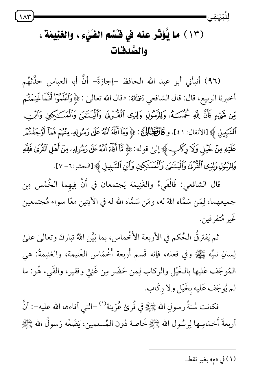 أخبرنا الربيع، قال: قال الشافعي - رحمه الله -: «قال الله تعالى: {وَاعْلَمُوا أَنَّمَا غَنِمْتُمْ مِنْ شَيْءٍ فَأَنَّ لِلَّهِ خُمُسَهُ وَلِلرَّسُولِ وَلِذِي الْقُرْبَى وَالْيَتَامَى وَالْمَسَاكِينِ وَابْنِ السَّبِيلِ} [الأنفال: ٤١]، وقال تعالى: {وَمَا أَفَاءَ اللَّهُ عَلَى رَسُولِهِ مِنْهُمْ فَمَا أَوْجَفْتُمْ عَلَيْهِ مِنْ خَيْلٍ وَلَا رِكَابٍ} إلى قوله: {مَا أَفَاءَ اللَّهُ عَلَى رَسُولِهِ مِنْ أَهْلِ الْقُرَى فَلِلَّهِ وَلِلرَّسُولِ وَلِذِي الْقُرْبَى وَالْيَتَامَى وَالْمَسَاكِينِ وَابْنِ السَّبِيلِ} [الحشر: ٦ - ٧].