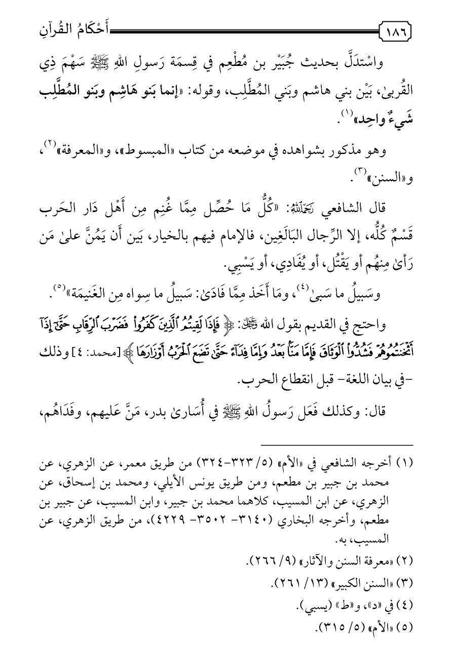 واحتج في القديم بقول الله - عز وجل -: {فَإِذَا لَقِيتُمُ الَّذِينَ كَفَرُوا فَضَرْبَ الرِّقَابِ حَتَّى إِذَا أَثْخَنْتُمُوهُمْ فَشُدُّوا الْوَثَاقَ فَإِمَّا مَنًّا بَعْدُ وَإِمَّا فِدَاءً حَتَّى تَضَعَ الْحَرْبُ أَوْزَارَهَا} [محمد: ٤] وذلك -في بيان اللغة- قبل انقطاع الحرب.
