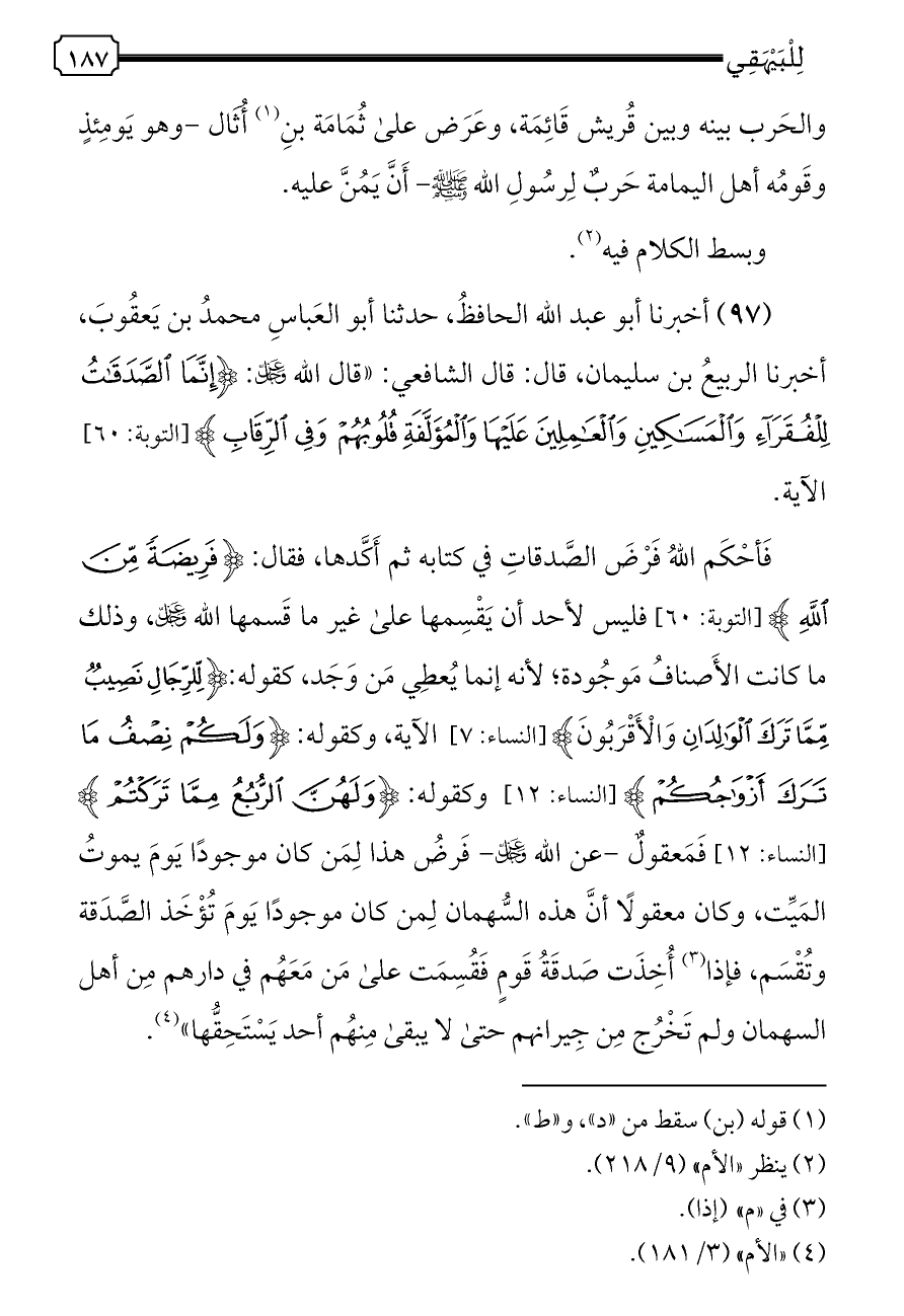 (٩٧) أخبرنا أبو عبد الله الحافظُ، حدثنا أبو العَباسِ محمدُ بن يَعقُوبَ، أخبرنا الربيعُ بن سليمان، قال: قال الشافعي: «قال الله - عز وجل -: {إِنَّمَا الصَّدَقَاتُ لِلْفُقَرَاءِ وَالْمَسَاكِينِ وَالْعَامِلِينَ عَلَيْهَا وَالْمُؤَلَّفَةِ قُلُوبُهُمْ وَفِي الرِّقَابِ} [التوبة: ٦٠] الآية.