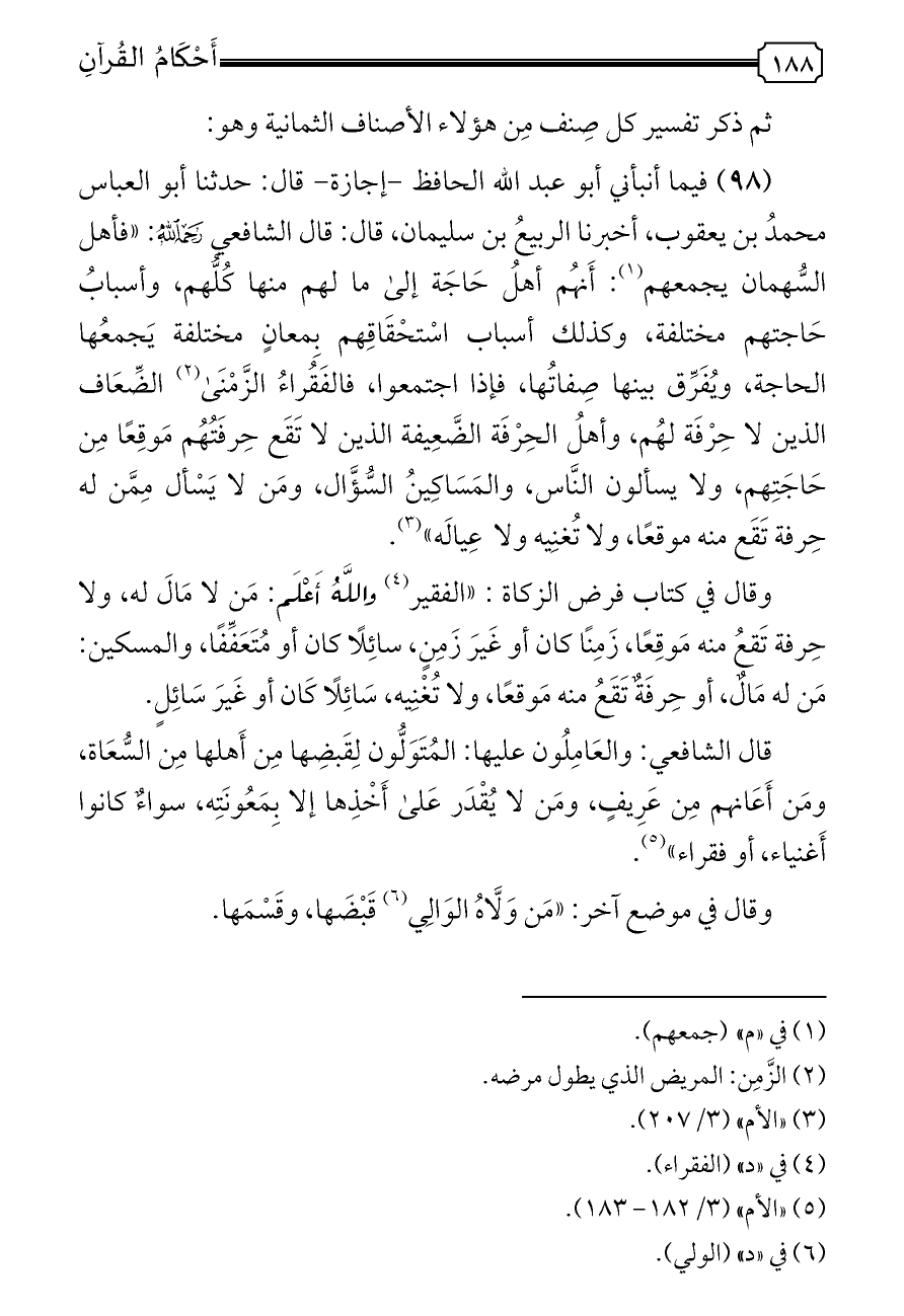 (٩٨) فيما أنبأني أبو عبد الله الحافظ -إجازة- قال: حدثنا أبو العباس محمدُ بن يعقوب، أخبرنا الربيعُ بن سليمان، قال: قال الشافعي - رحمه الله -: «فأهل السُّهمان يجمعهم (¬١): أَنهُم أهلُ حَاجَة إلى ما لهم منها كُلُّهم، وأسبابُ حَاجتهم مختلفة، وكذلك أسباب اسْتحْقَاقِهم بِمعانٍ مختلفة يَجمعُها الحاجة، ويُفَرِّق بينها صِفاتُها، فإذا اجتمعوا، فالفَقُراءُ الزَّمْنَى (¬٢) الضِّعَاف الذين لا حِرْفَة لهُم، وأهلُ الحِرْفَة الضَّعِيفة الذين لا تَقَع حِرفَتُهُم مَوقِعًا مِن حَاجَتِهم، ولا يسألون النَّاس، والمَسَاكِينُ السُّؤَّال، ومَن لا يَسْأل مِمَّن له حِرفة تَقَع منه موقعًا، ولا تُغنِيه ولا عِيالَه» (¬٣).