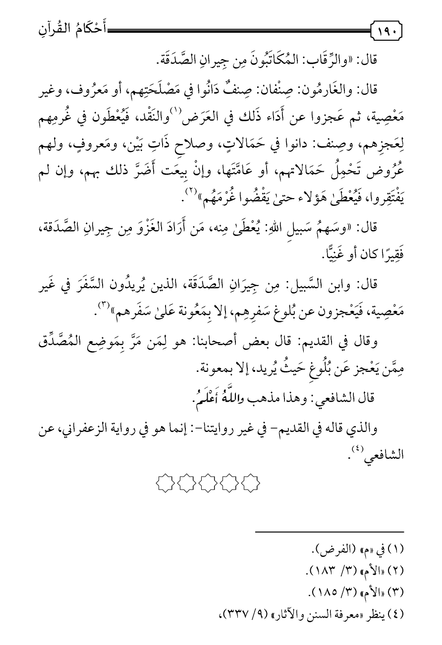 قال: وابن السَّبيل: مِن جِيرَانِ الصَّدَقَة، الذين يُريدُون السَّفَرَ في غَير مَعْصِية، فَيَعْجزون عن بُلوغ سَفرِهِم، إلا بِمَعُونة عَلى سَفَرهم» (¬٣).