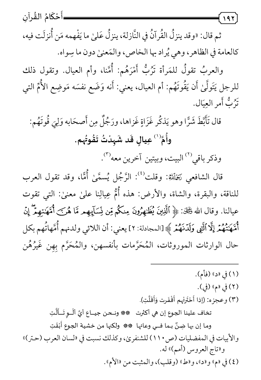 قال الشافعي - رحمه الله -: وقلت (¬٤): الرَّجُل يُسمَّى أُمًّا، وقد تقول العرب للناقة، والبقرة، والشاة، والأرض: هذه أُمُّ عِيالِنا على معنى: التي تقوت عيالنا. وقال الله - عز وجل -: {الَّذِينَ يُظَاهِرُونَ مِنْكُمْ مِنْ نِسَائِهِمْ مَا هُنَّ أُمَّهَاتِهِمْ إِنْ أُمَّهَاتُهُمْ إِلَّا اللَّائِي وَلَدْنَهُمْ} [المجادلة: ٢] يعني: أن اللائي ولدنهم أُمَّهاتُهم بكل حال الوارثات الموروثات، المُحَرَّمات بأنفسهن، والمُحَرَّم بِهِن غَيرُهُن